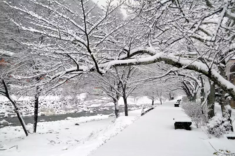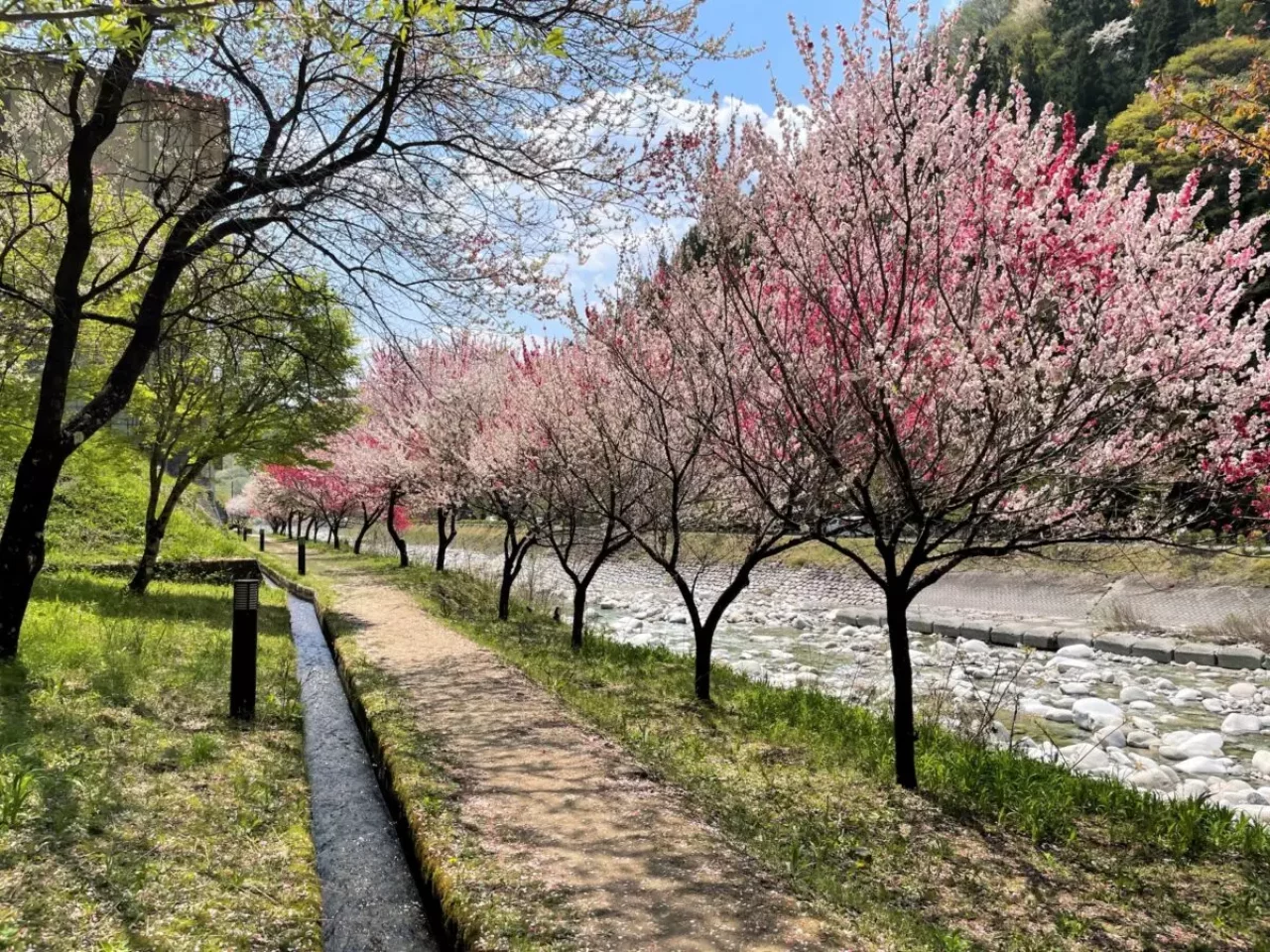 実際の花桃街道は、言葉にできないほどに美しい!!昼神温泉は約200本の花桃が阿智川沿いに咲き乱れます。新芽が息吹いた時も、爽やかな緑が広がり清々しいです。雪が積もったときは、足跡をつけて遊ぶのも楽しいでしょう。