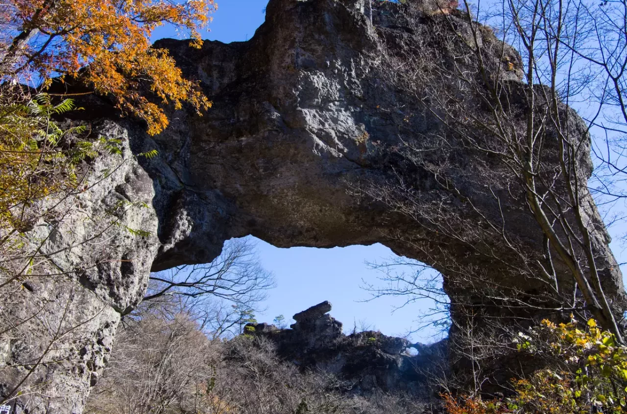 また、山内にある石門も有名スポットです。妙義山には4つの石門があり、特に第4石門は巨大な岩のアーチになっていて壮観。妙義山には複数の奇岩がありますが、なかでも名の知られている「大砲岩」が第4石門のアーチからのぞけます。また、第4石門の脇から見られる絶景、「日暮の景」も見逃せないポイント。