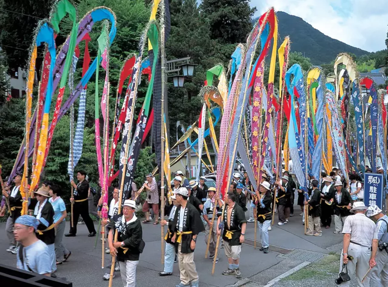 毎年7月に行われており、夫神岳の頂上で祈りをささげた後に、幟を掲げて別所温泉に下り、地区内を練り歩きます。色とりどりの布のついた幟が何本も並びながら山肌を下ってくる光景は圧巻です。