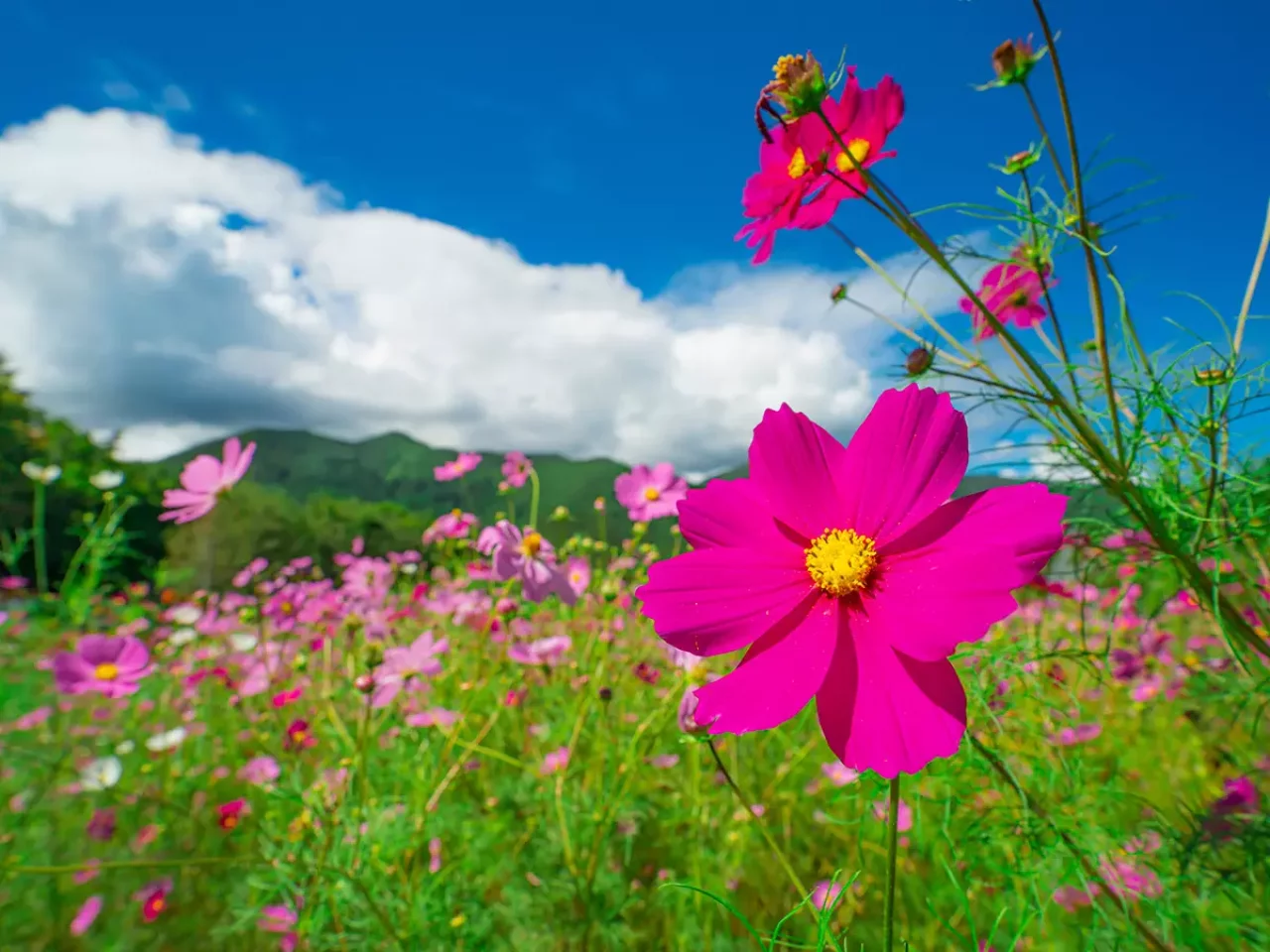 駐車場は治部坂スキー場を利用しますが、秋はゲレンデがコスモス畑になっています。1970年代に別荘地として開発され、当時植えられた樹木は、たいそう立派になりました。セレブな雰囲気満載の森の散策もできます。