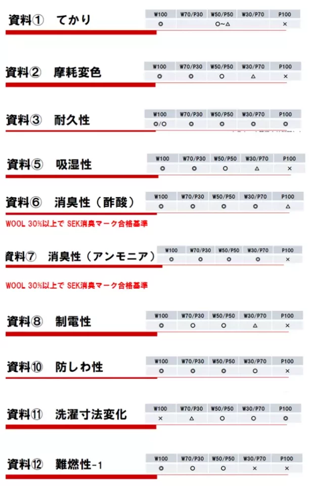 まず吸湿性についてはウール70%以上だとウール100%の時と比較してほとんど差がないという結果で、50%で合格基準に満たしているというデータです。ウール30%になると若干機能が劣るということが分かっています。