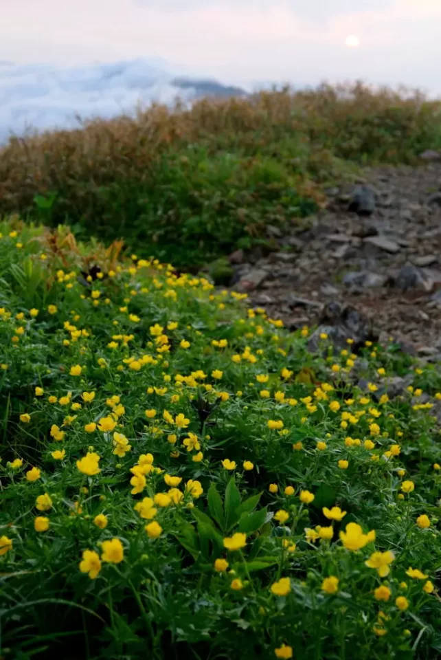 茂倉岳山頂、朝日を浴びて輝くミヤマキンバイ ミヤマキンポウゲの群落。ずっとミヤマキンバイと思い込んでました。花の色形と植生は凄く似てるけどキンバイはバラ科、ミヤマキンポウゲはキンポウゲ科と科が異なり、親戚ですらないという、、、。高山植物の代表、ハクサンイチゲはキンポウゲ科で親戚です。ちなみに桜と苺、リンゴはバラ科で、、、脱線しました。