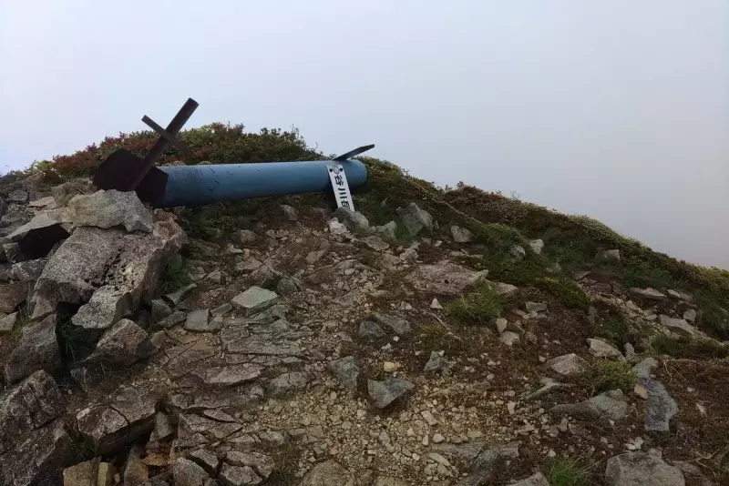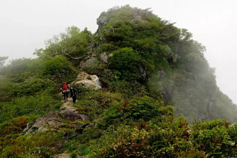 万太郎山頂は突風とガスの中、多くの万太郎山レポートでも「風の谷」との形容される場所、森林限界低いのには理由があるわけです。
