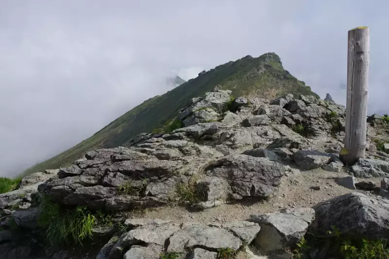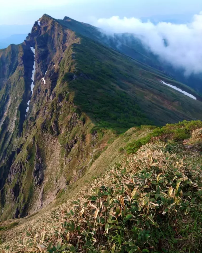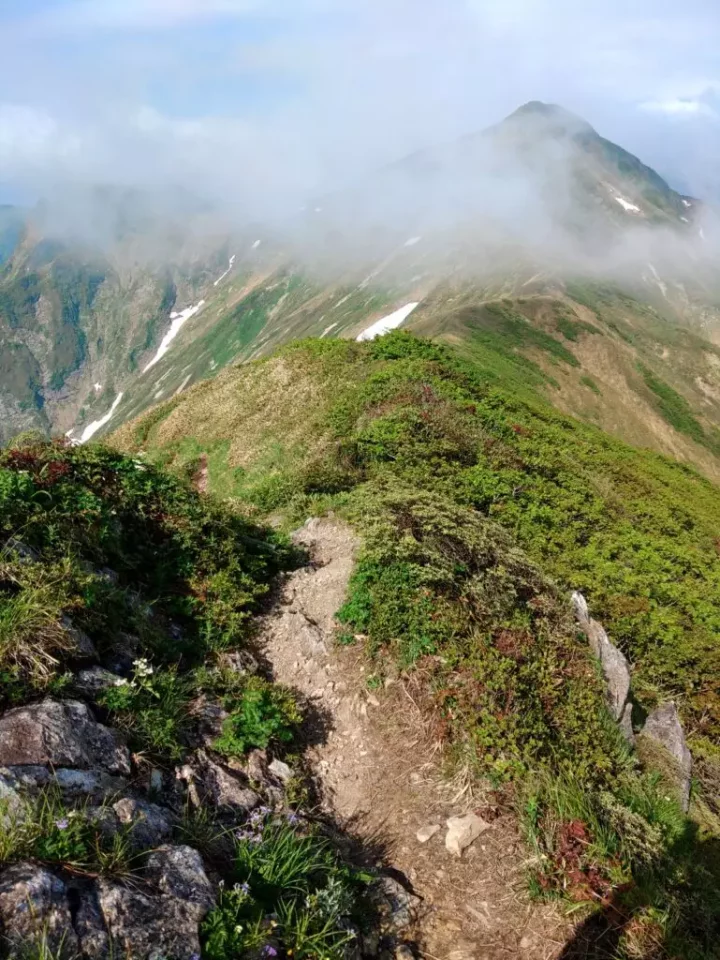 雲間に霞んで見えるオジカ沢ノ頭、肩ノ小屋より谷川連峰主脈に入ります。ここから先は万一の事故や怪我、体調不良となっても DOCOMO・AU・SoftBank 「3社とも圏外」ですので救援は呼べません。お気を付けください。