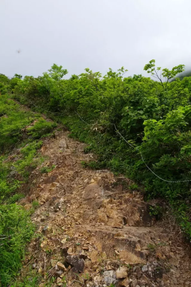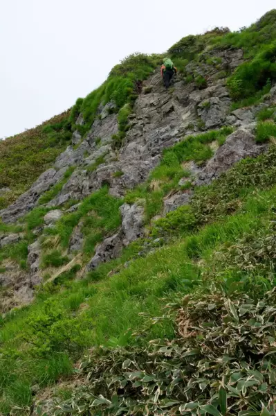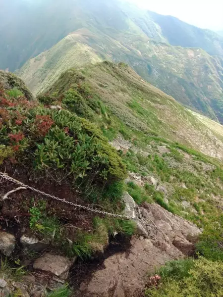 基本、穏やかな稜線ですがオジカ沢ノ頭の鎖とロープ、それには頼らず基本の3点支持で登る先行者。ビビリーな自分はけっこう緊張しました。