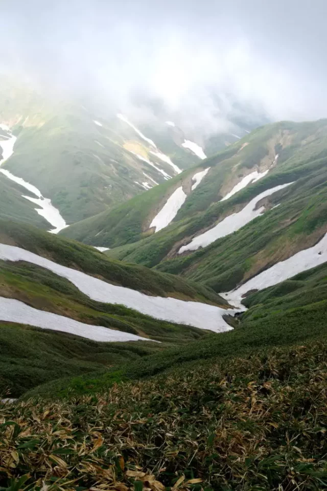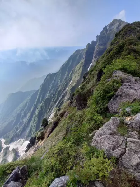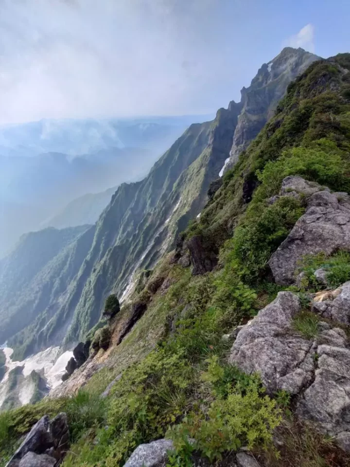 美しいゼブラ模様の万太郎山東面、雪渓からの涼風とミストは夏の日差しをブロック、いや寒くて薄手のシェルを。7月17日の今日現在はほぼ消失しています。