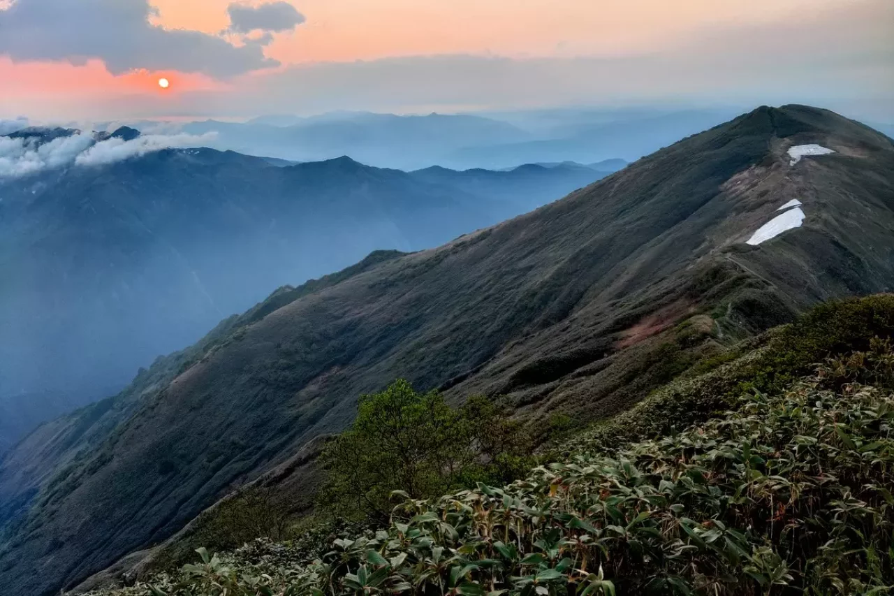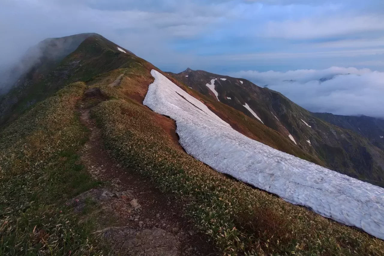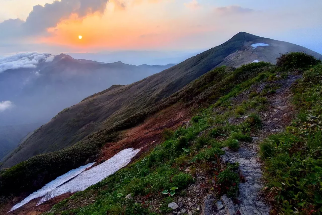 ここから一ノ倉岳までの日の出と共に移動の1キロ、うつろう雲海の生む光と影、そこに浮かぶ稜線、輝く残雪と高嶺の花々。軽くはない装備と登るテント・小屋泊はこの時を愉しむ為と思います。