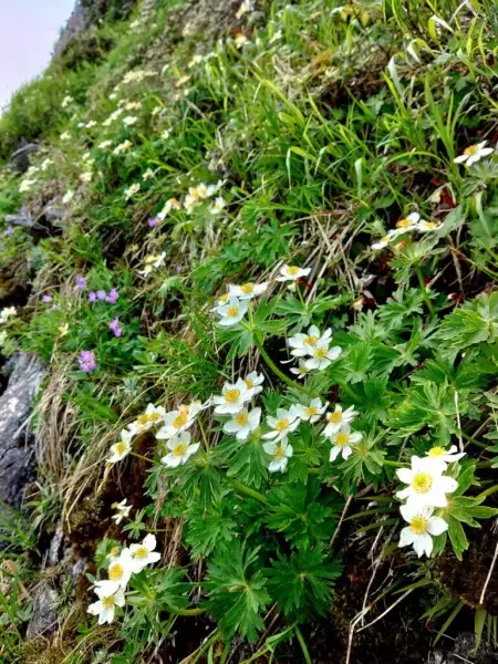 肩の小屋から少し進むとハクサンイチゲの群落がお出迎え。