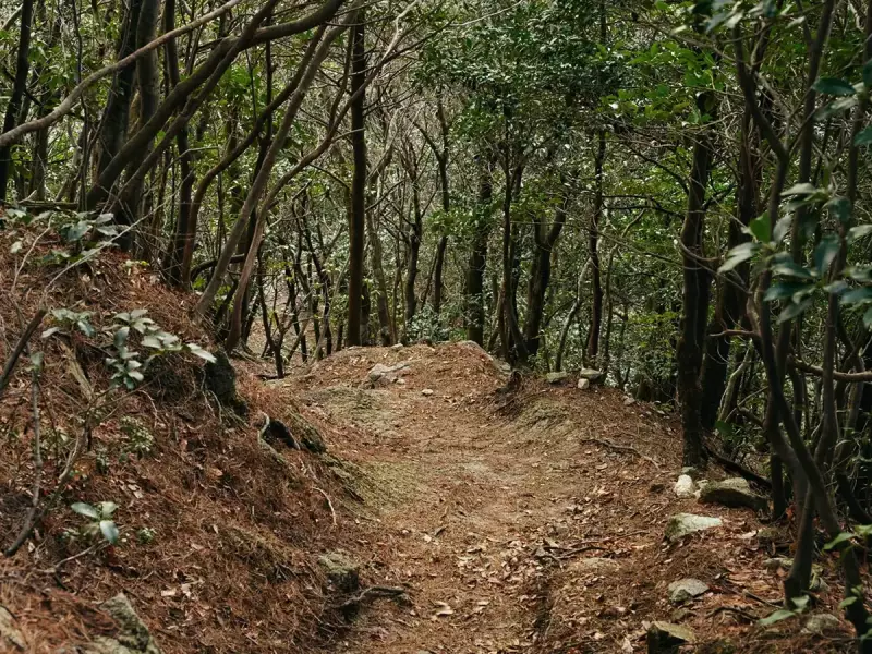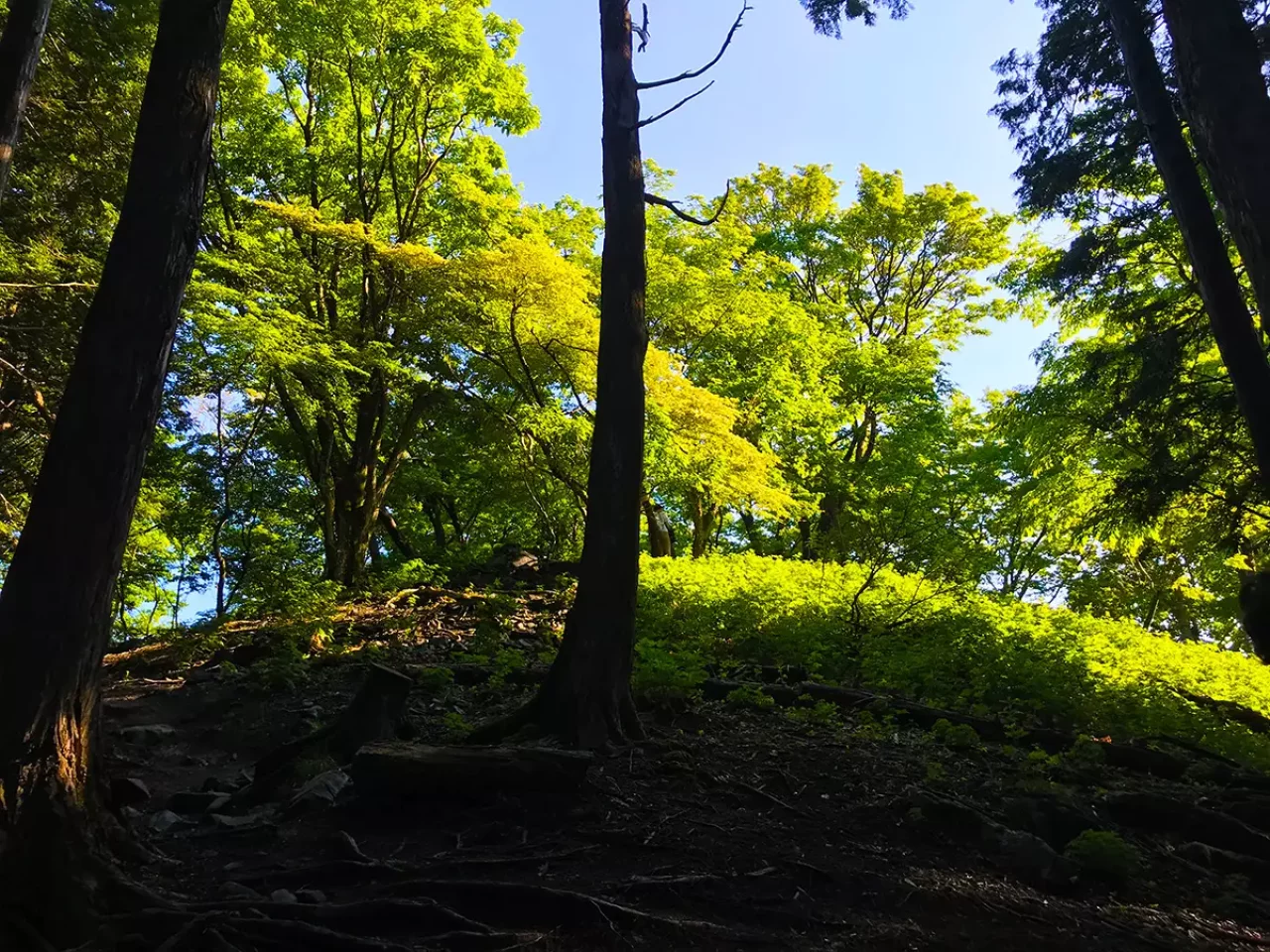 樹林帯がふもとまで続きます。森林浴が気持ち良い登山ルートですが、足場がビックリするほど悪い時も!第一印象は「どうしよう!」と驚くこともあるかもしれませんが、自分の歩幅に合った場を探して降りれば、初心者でも普通に下りれます。