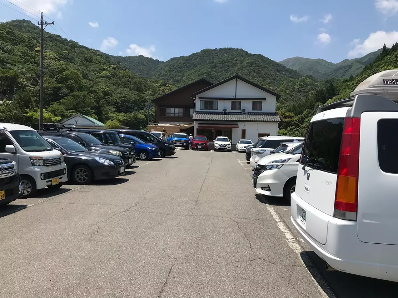 宇賀渓キャンプ場駐車場に70台の駐車が可能です。週末は朝6:00に満車になることもあるので、早い時間の登山開始がおすすめです。満車になったあとは、空地が臨時駐車場になります。係の方が指定する場所へ駐車します。