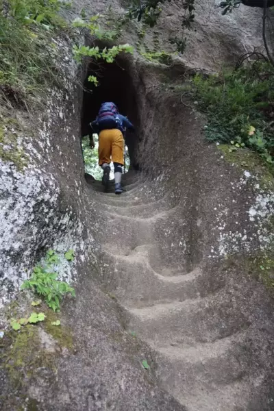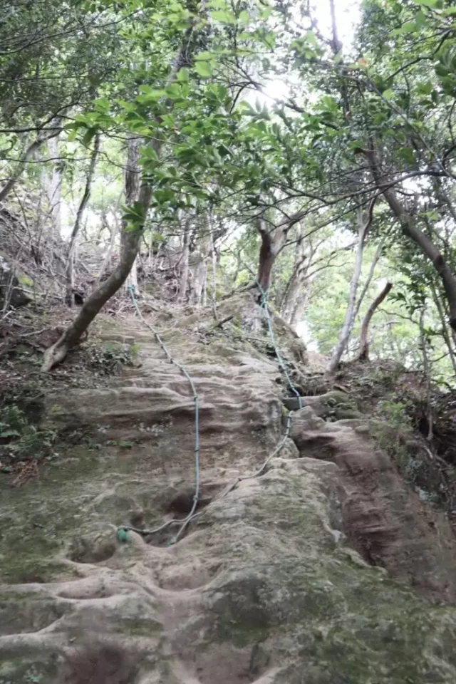 そして、ゆったり登山道も高宕山観音堂までです。観音堂から山頂までは岩のトンネルをくぐったり、ロープを用いて岩をのぼったり、とアスレチックのような岩場も。