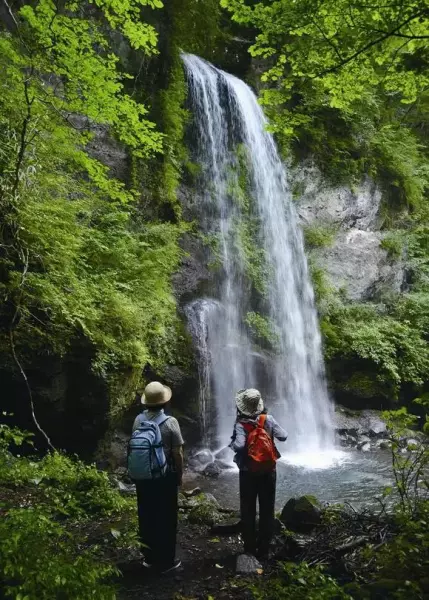 金太郎が産湯を使ったという伝説がある、落差23m、幅5mの滝です。毎年7月第1日曜日には、登山やキャンプの安全祈願のための「夕日の滝びらき」が行われます。