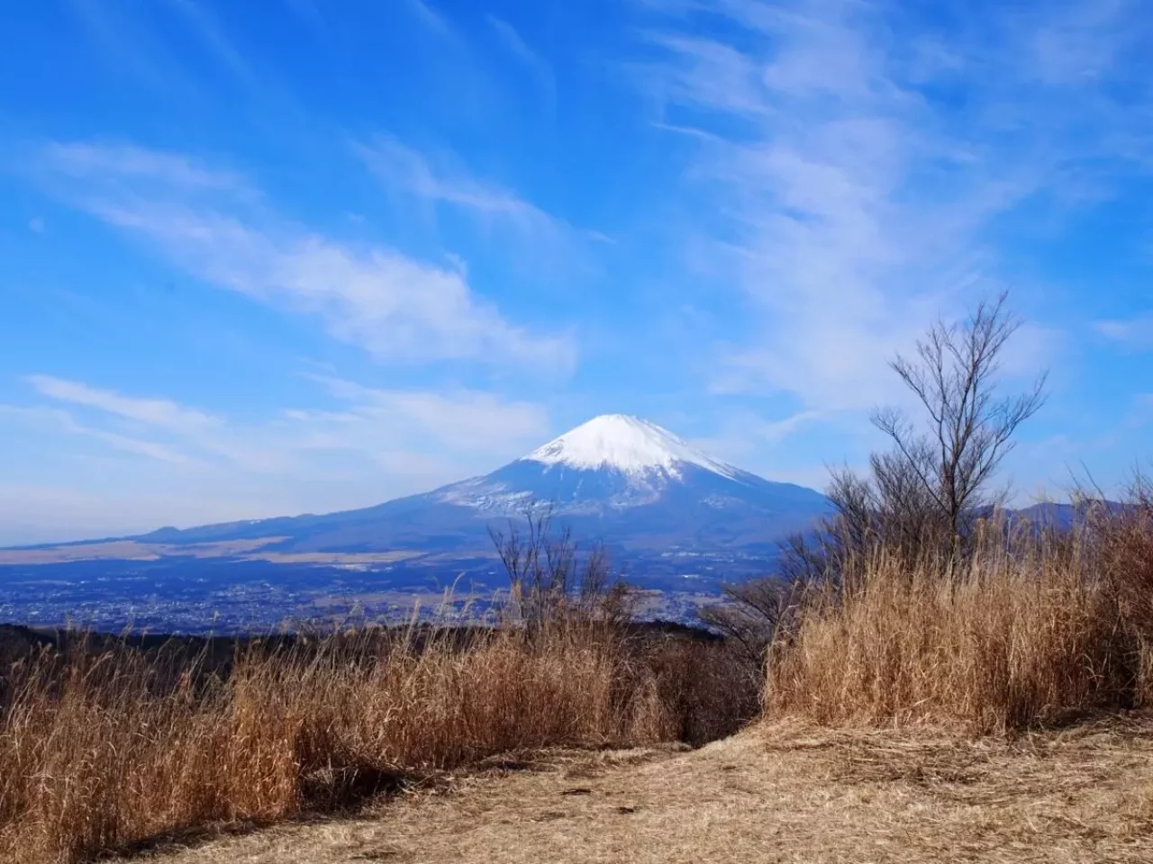 山頂は広々とした草原で、目の前にはどっしりとそびえたつ富士山をはじめ、金時山、明神ヶ岳、小田原の町並みから相模湾に浮かぶ江の島まで、一大パノラマが広がっています。急登に後にとりつく頂上だけに、感動もひとしおです。