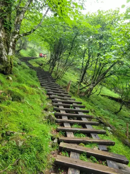 満開のバイケイソウ、広葉樹の樹林帯、苔を堪能し、木の階段を越えれば弥山小屋到着。