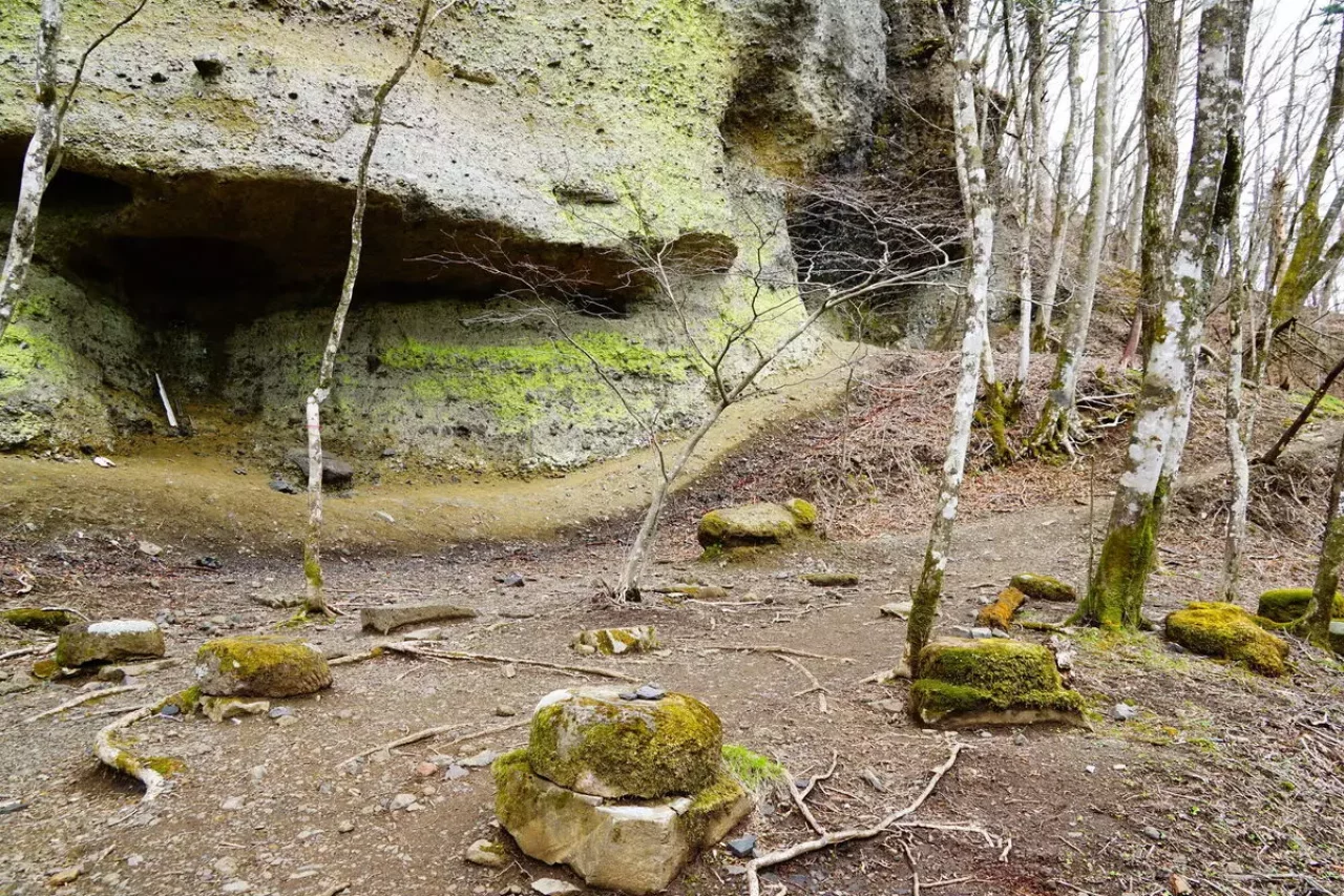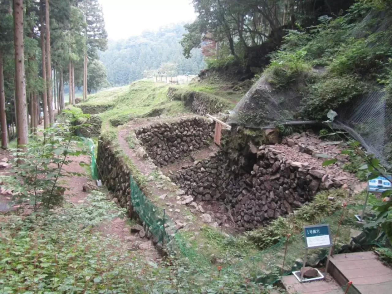 | 鋏岩修験場跡 | 標高1,080m地点にある、古の修験道場跡地。 巨大な岩から修行の厳しさを感じられる。 背後の絶壁は地層の縦模様が観察可能。 |