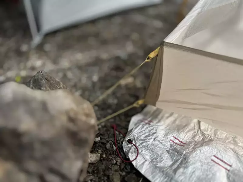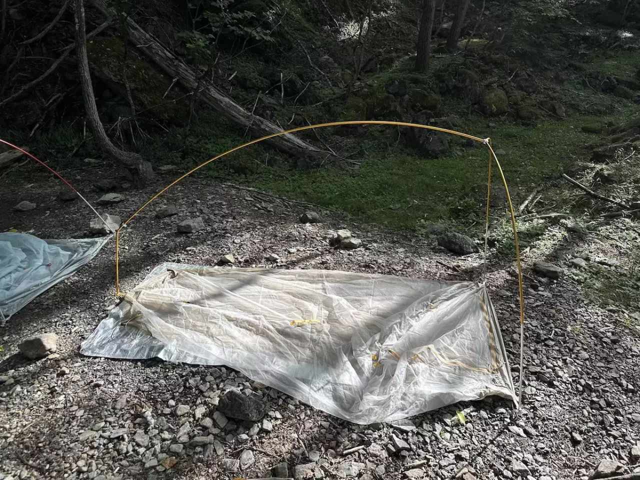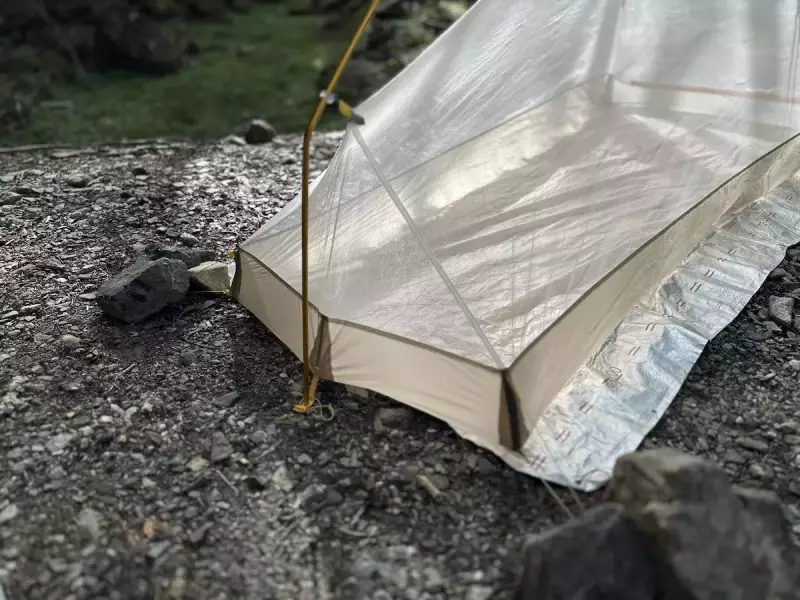 インナーテントの足側の角はガイラインを使ってテンションをかけることでバスタブが立ち上がるように作られています。最後にフライシートをインナーテントの上からかけて必要な箇所にペグダウンをして設営完了です。慣れればおおよそ5〜10分程度で設営を終わらすことができます。