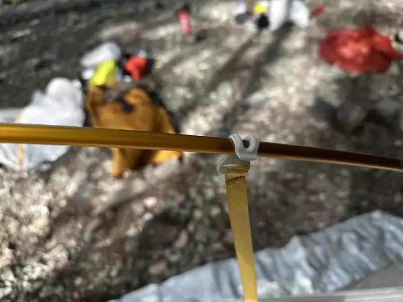 テントの設営方法は非常にシンプルで、ポールを組み立てたらインナーテント本体の3つのポイントにポールを指して、インナーテントのフックをポールに引っ掛けて自立します。