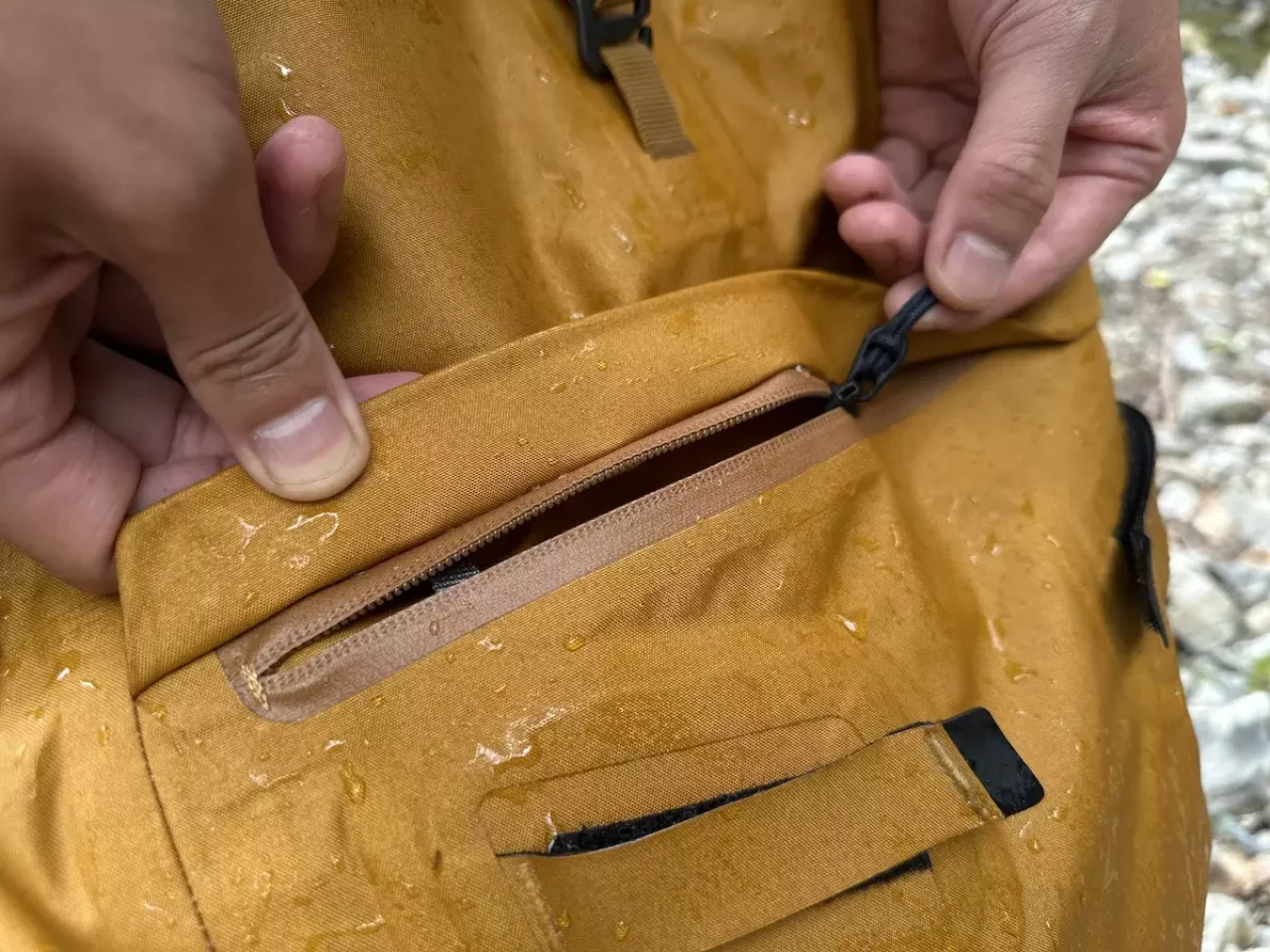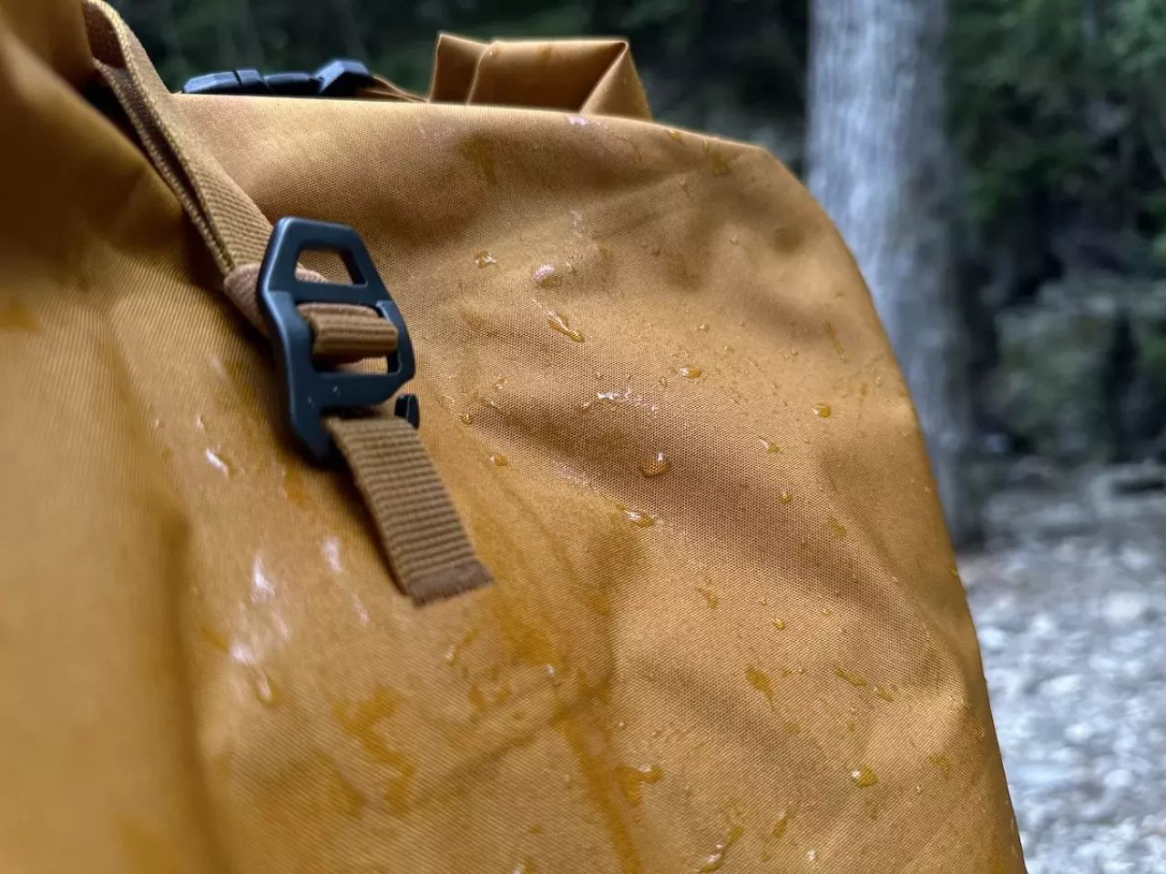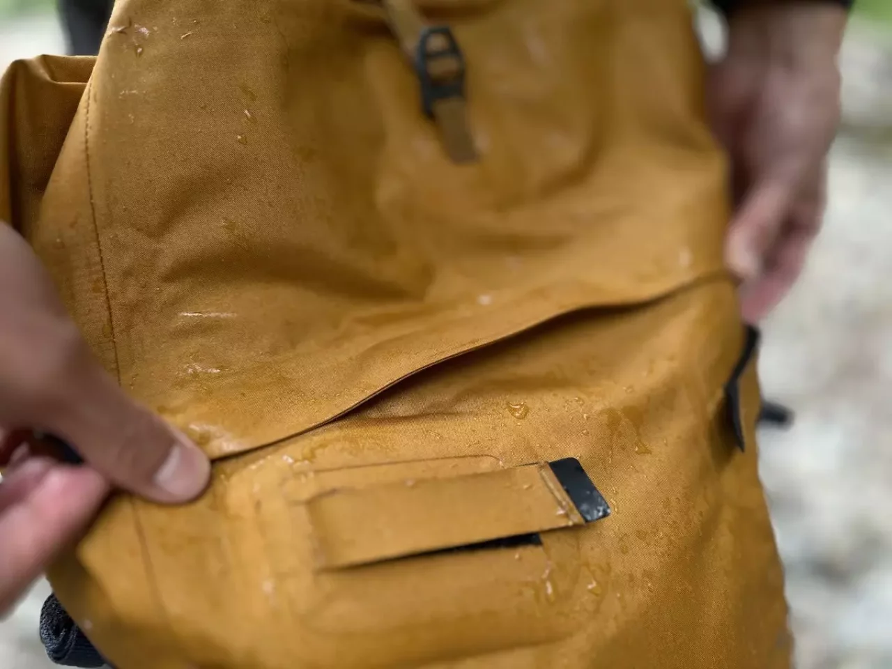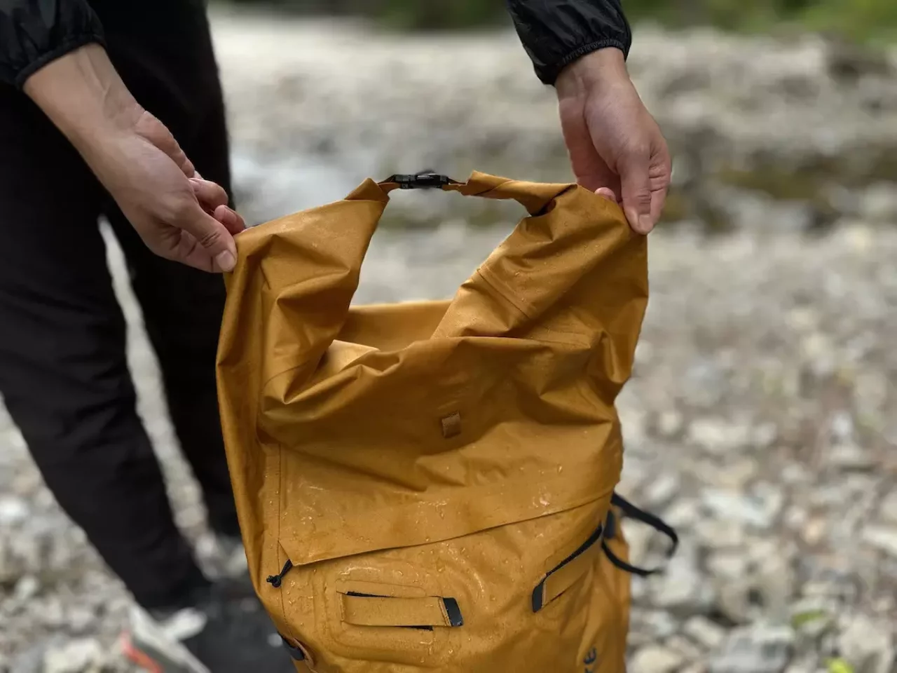 防水ファブリックを使用しているので雨に当たっても保水してザックが重くなりづらく中のものを濡らす心配が非常に少ないです。シームテープが施され、さらにロールトップタイプなので雨が降っても中のものが濡れづらい安心感のあるデザインです。