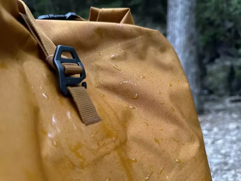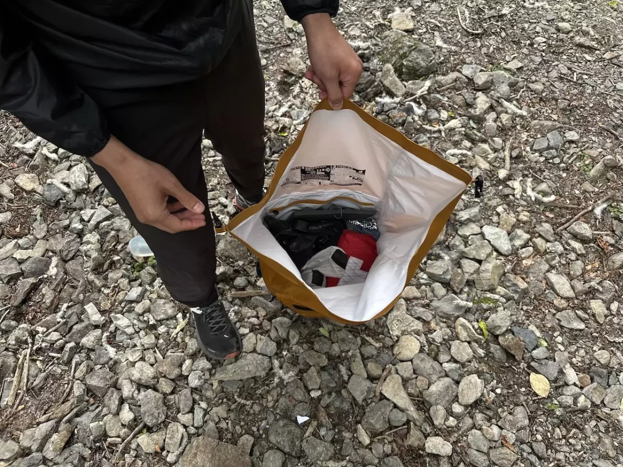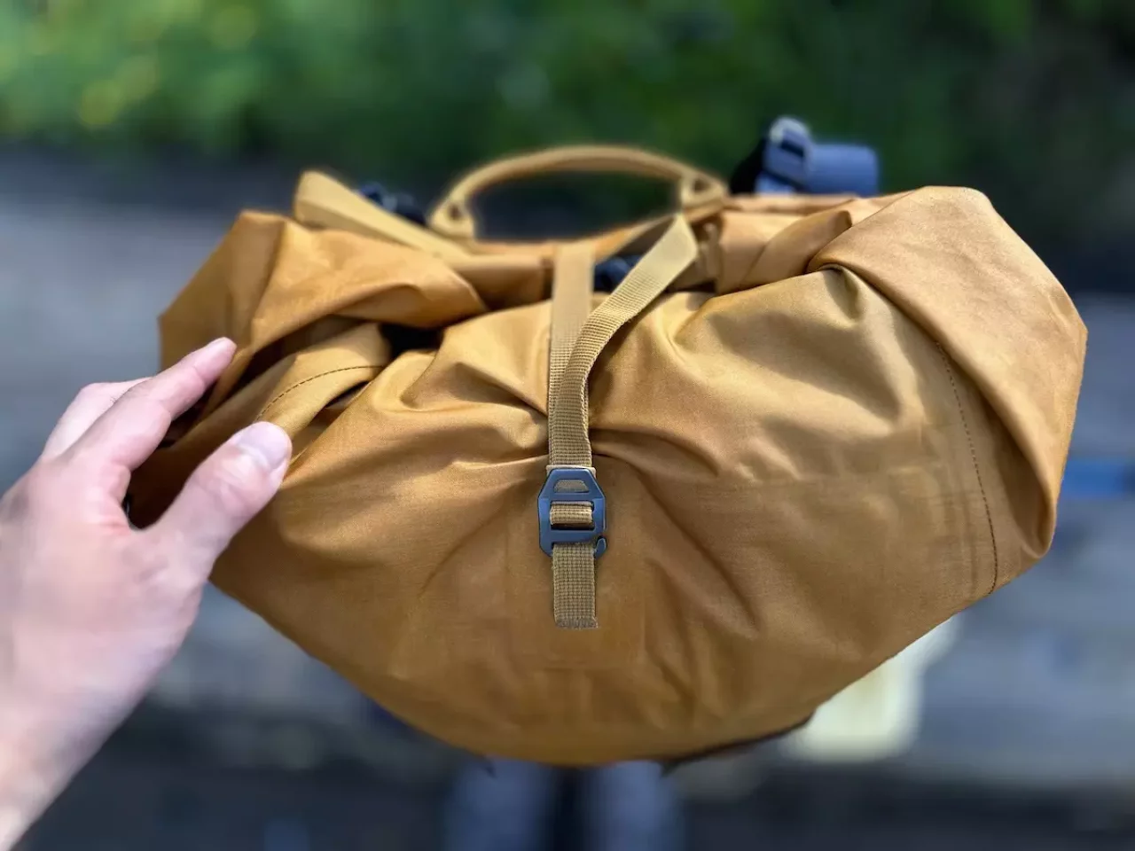 完全防水ではないので、雪の付着や雨による濡れを最小限に抑える程度と考えて使用することが前提です。ロールトップタイプなので、上部の凹凸に水が溜まってしまうことがあるのは気になるポイントです。
