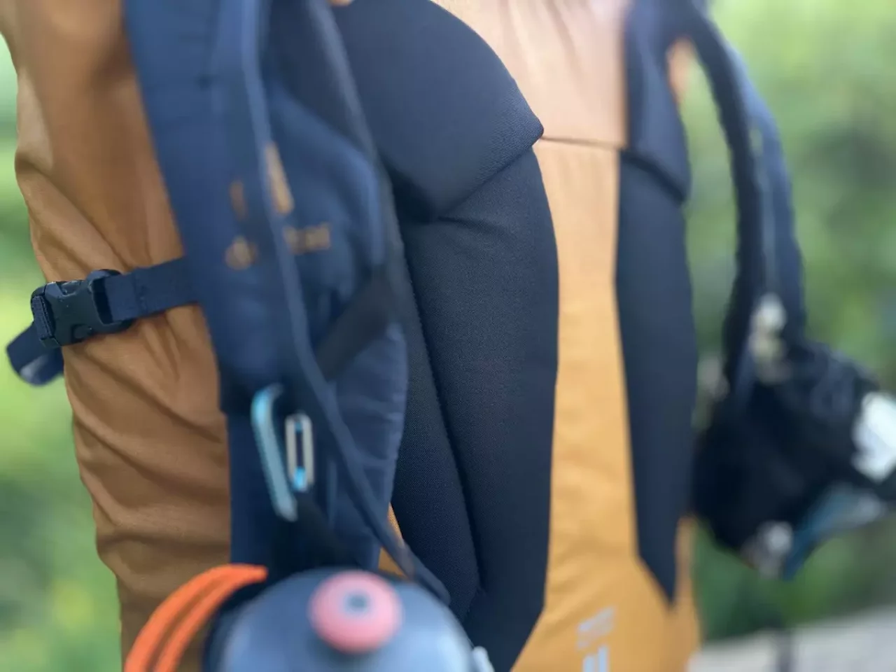 背面部分のパッドは凹凸があり、背中に優しくフィットします。最初見た時には通気性の面で背中が熱くなりそうだなと思いましたが、メッシュ構造を採用しているザックと比較するとさすがに通気性の面では劣りますが、背中が熱くて不快に感じることはありませんでした。