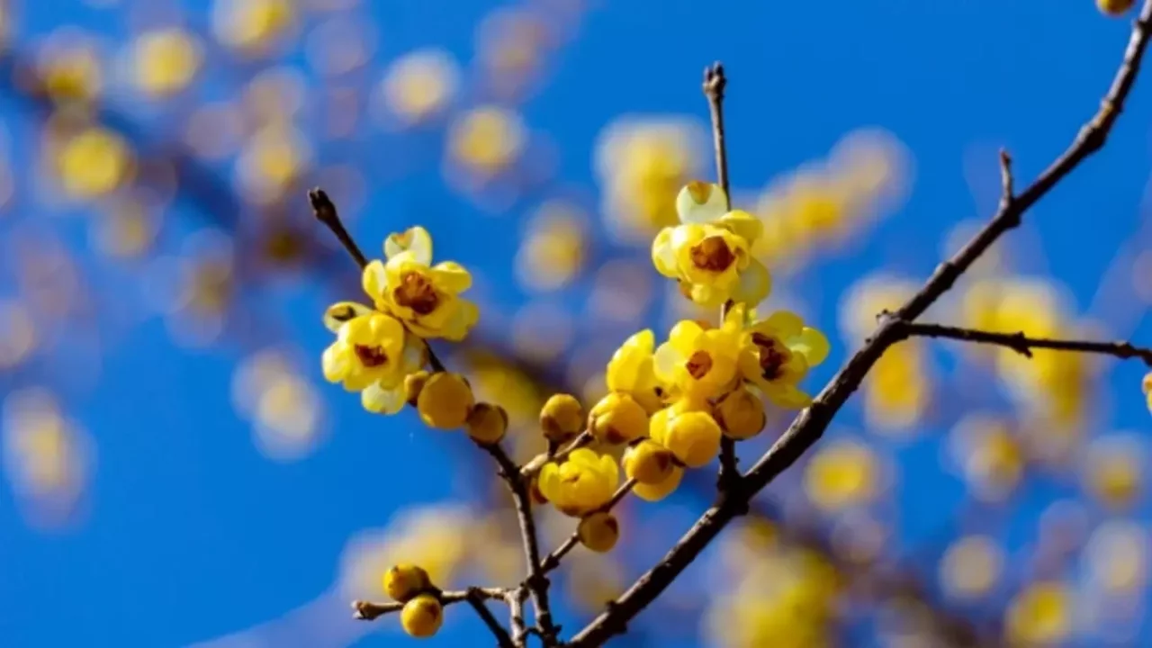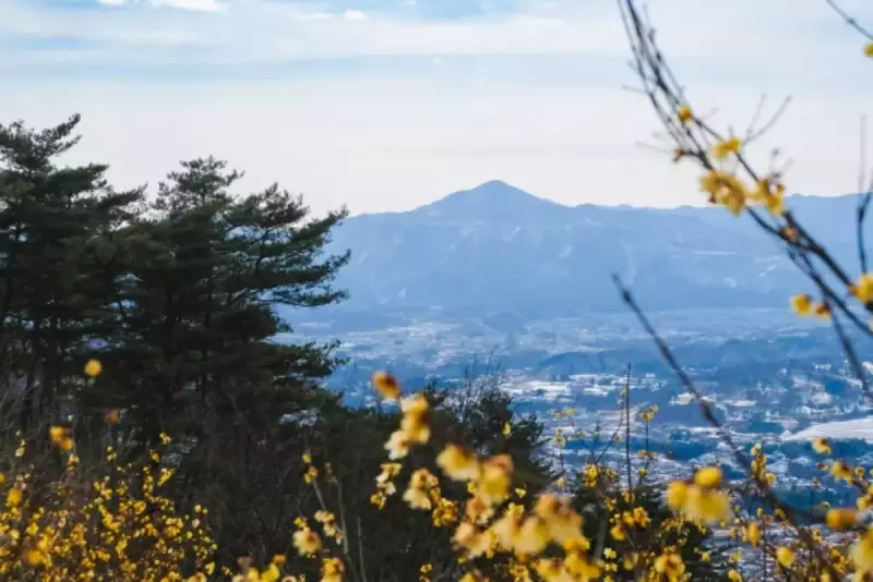 2つ目の魅力は一面に咲き誇るロウバイの花です。山頂には東ロウバイ園と西ロウバイ園の2つがあり、合計面積は5,000平方メートル。広大な敷地に約3000本のロウバイが植えられています。例年12月下旬~2月下旬ごろに見ごろを迎え、冬の澄み渡った青空と黄色い花のコントラストは絶景です。