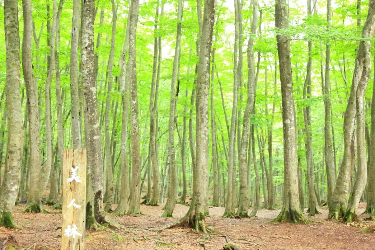 鍋倉山の特徴は、何といっても辺り一面に広がるブナの森です。ブナの森は、木々の間隔が広めの疎林で、一本一本のブナが大きくなる巨木の森が広がります。また、保水力が非常に高く幹に耳を当てると水の音が聞こえると言われるほどで、豊かな水源地になっています。