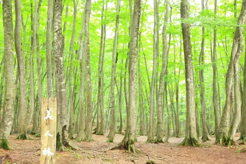 ブナの巨木が乱立する片斜面を進み、大きく左に曲がって行くと、巨木の森の案内標識が現れます。山頂方面には、まっすぐ進んだ方が近いですが、せっかくなので森姫や森太郎を経由していくといいでしょう。