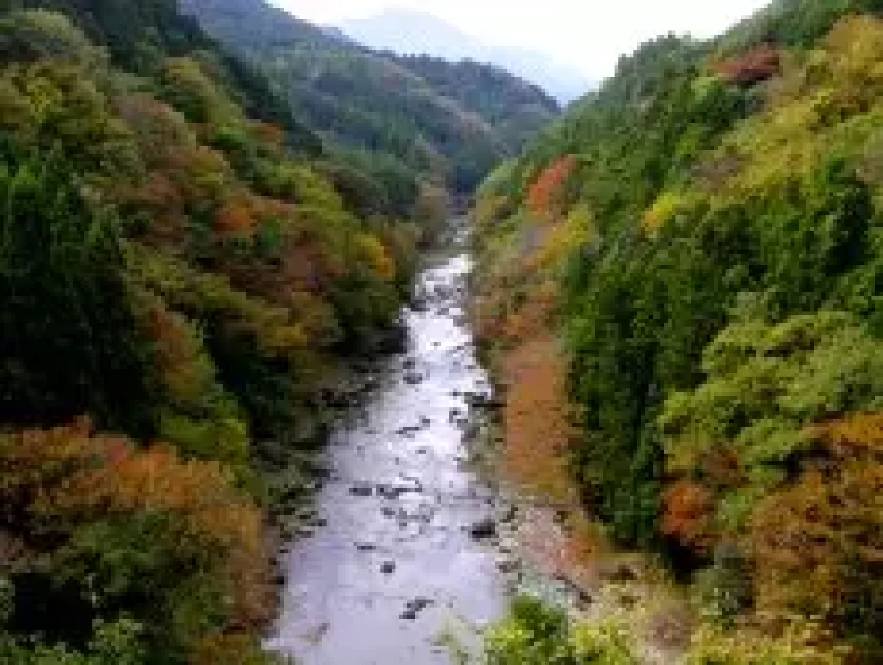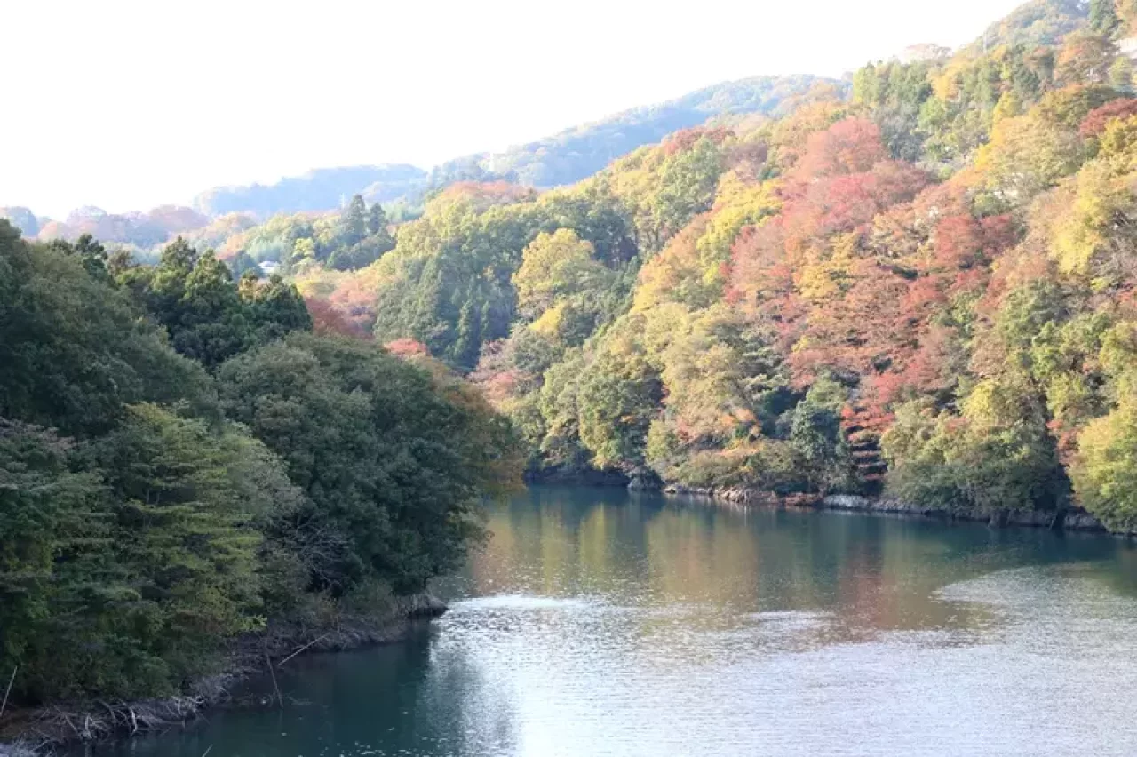 伏馬田入口バス停から歩いて亀見橋へ向かいます。亀見橋から見える道志川の清流と山々の風景は美しく、特に秋の紅葉の時期は見事です。