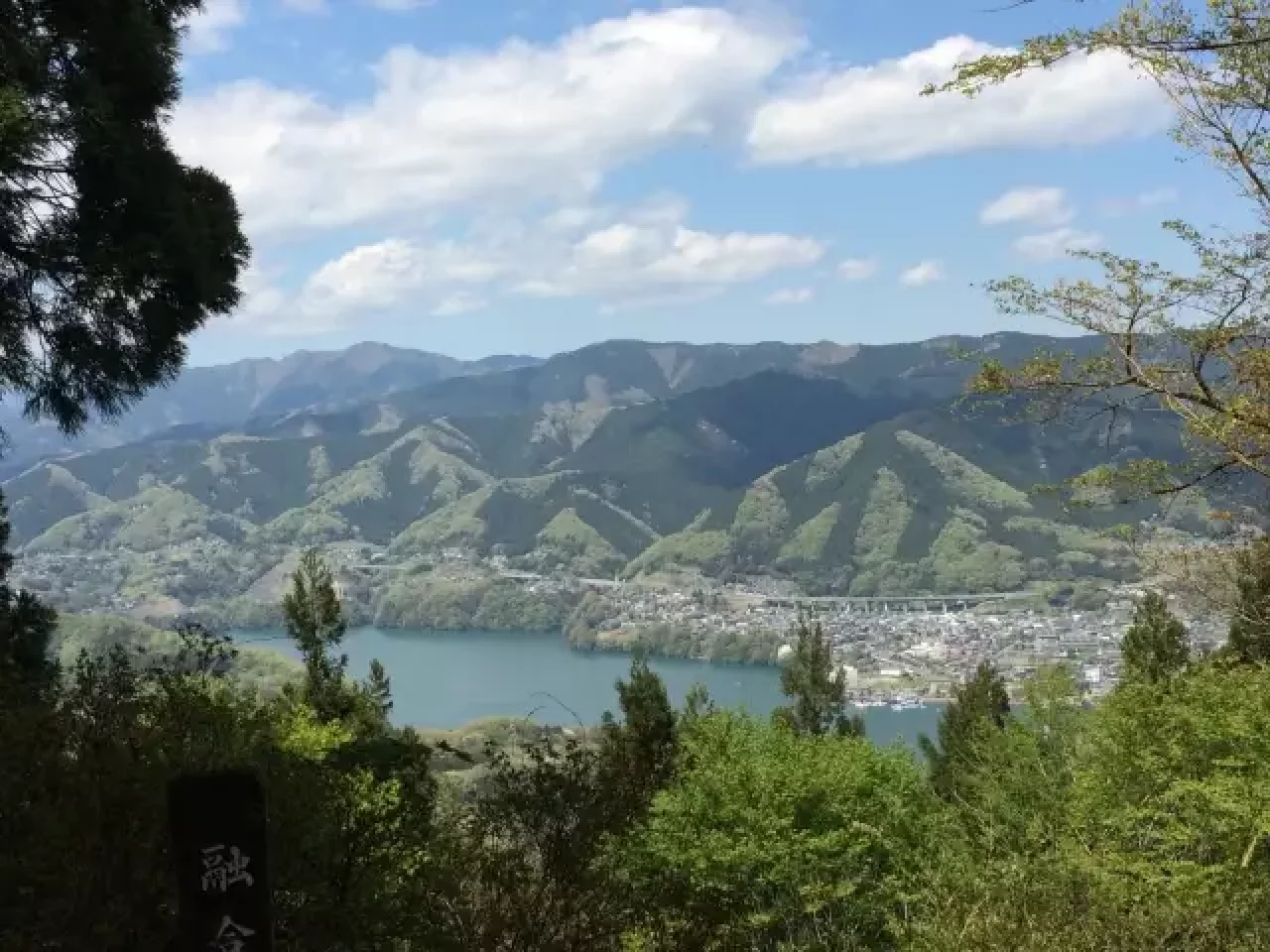 石老山山頂からは、大明神へ向かいます。祠のある大明神を過ぎるとまもなく大明神展望台に到着し、相模湖の雄大な景色が望めます。