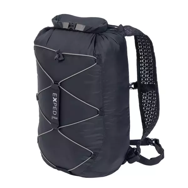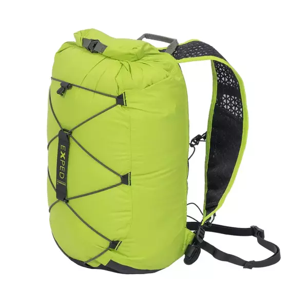 防水仕様のロールトップ型のスタッフバッグです。サイドに設けられたメッシュポケット、コンプレッションベルト、フロントに設けられたジッパー付きポケットなどパッカブルできる日帰り向け登山用ザックという位置づけです。通気性に優れたヘアメッシュショルダーハーネスやチェストベルトによるフィット感の良さも特徴です。