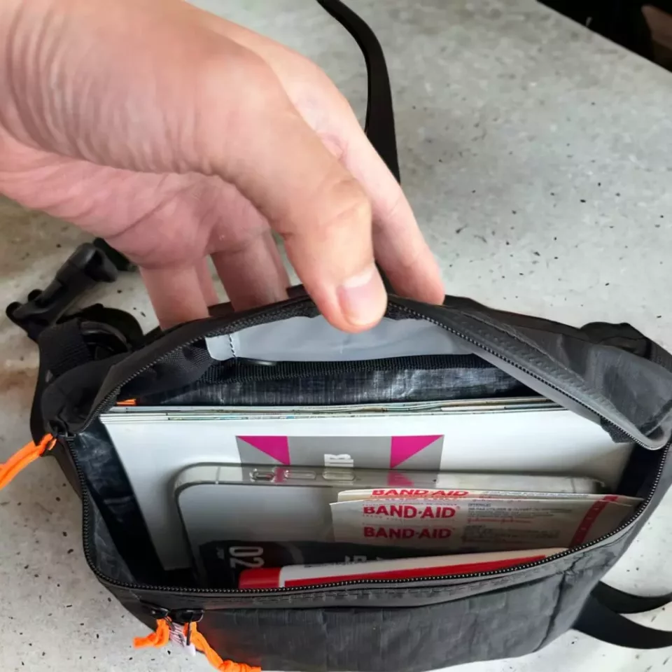 サコッシュはスマートフォン、紙地図、財布を収納しています。これらを取り出しやすい山旅のULサコッシュは非常に使いやすく普段からも愛用しています。