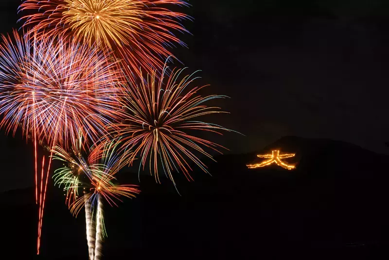 箱根大文字焼は毎年8月16日の夜に開催される箱根の夏の風物詩で、明星ヶ岳山腹に浮かび上がるオレンジ色の「大」の字と華やかな花火との競演が、訪れる観光客を魅了します。