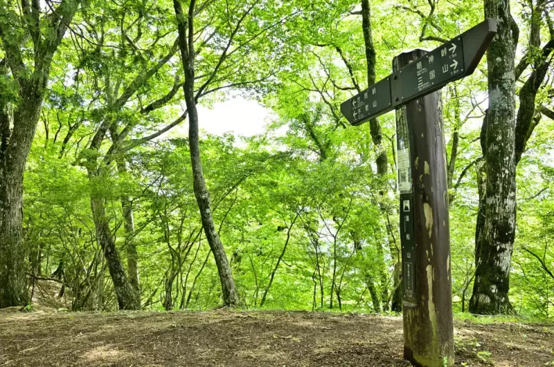 先に紹介したコースと逆回りに進んで湯船山へと向かいます。湯船山山頂からはなだらかに下り、鉄塔を通過して明神峠へ。明神峠から三国山へは途中、車道を横断して登山道へ入ります。