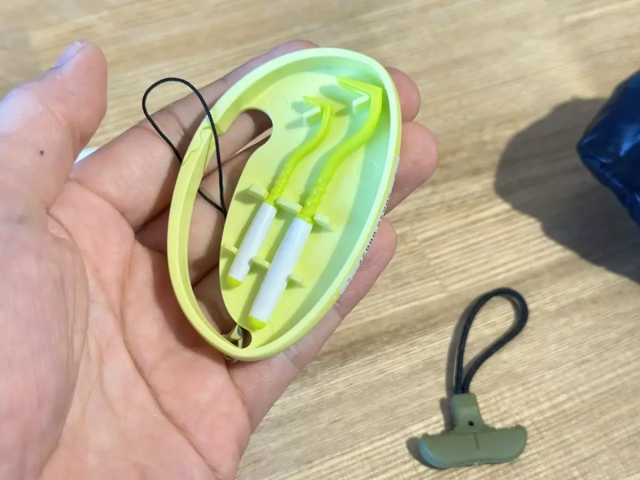 もしも 噛まれてしまって 不用意にマダニを引っ張ると、 マダニの頭と口が皮膚内に残ってしまい、 さらには マダニの中に 潜んでいるウイルスが一気に 皮膚の中に 押し込まれる可能性があるので、 マダニに噛まれた時の 対策も登山では 重要視しています。 そこで 使っているのがティックツイスター で、 血を吸っている マダニを見つけたら マダニと肌の隙間にティックツイスターを差し込んでツイスターを回転させながら少しずつ引っ張っていくと、マダニを取り除くことができます。 2種類の大きさがあるので、 マダニの大きさで 使い分けます。