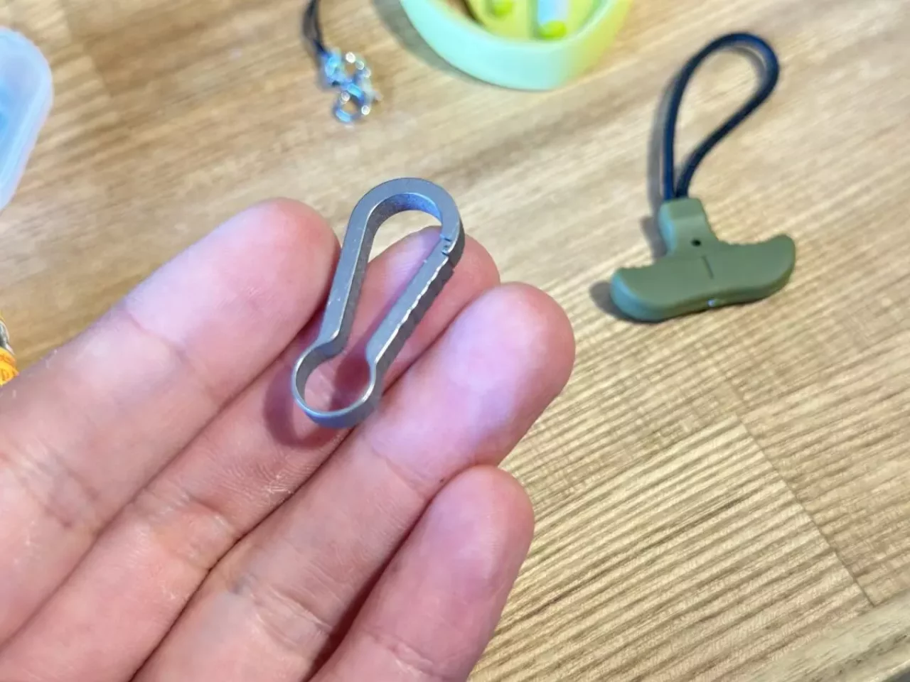 長さ3.2cm×幅1.38cm×厚さ0.4cmで、 僕が知っている中では 最も コンパクトなカラビナです。 小さすぎても カラビナ としての 機能が損なわれてしまうのですが、 このカラビナ は継ぎ目のない一体成型で仕上げているので、 壊れることがなく、 絶妙な 張りのある バネ性で 使い心地にも優れています。 閉じた時には 継ぎ目部分がフラットに なるので カラビナで引っ掛けた、 例えば ベルトループ や ガイライン、 あらゆる コードが引っかかりづらく 使いやすいです。