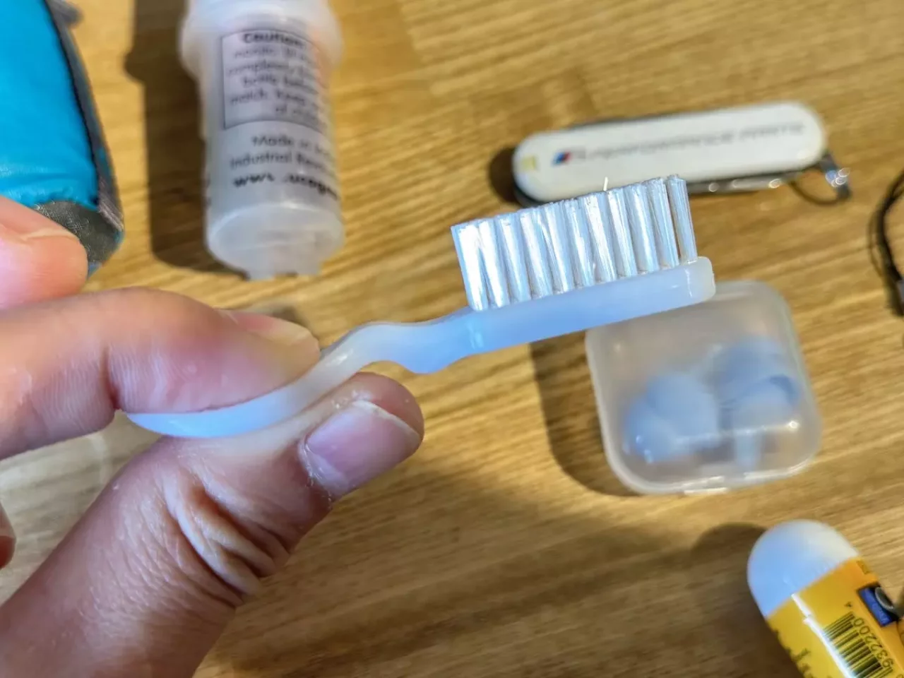 人差し指ぐらいの長さのとてもコンパクトな歯ブラシです。長さは7.5cmで短いけど親指と人差し指でしっかりと固定して歯を磨くことができるので磨きづらいことはありません。歯を磨きたいと思った時に歯ブラシが見つからない時があるので、手持ち部分の穴に細引きを通してザックの外側にくっつけるようにしています。こうすることで行動食が歯に詰まった時とか、口の中が気持ち悪いと感じた時にすぐに歯を磨くことができます。これはめちゃくちゃおすすめです。