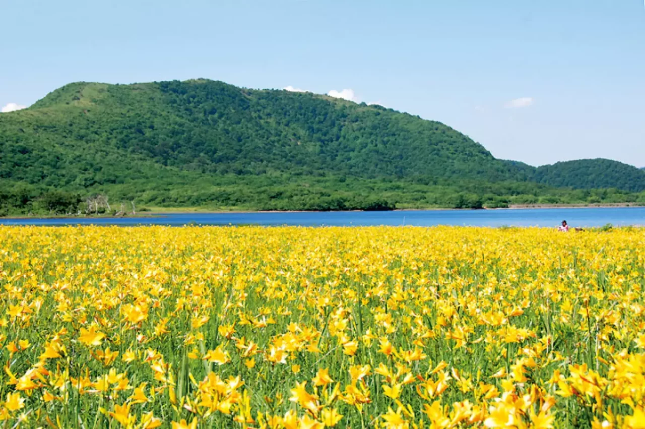 雄国沼湿原(標高1089m)のニッコウキスゲは、面積当たりの生息株数は尾瀬ヶ原を上回り日本一。満開の時期には、あたり一面が黄色い絨毯に染めあがります。見頃は7月初旬です。