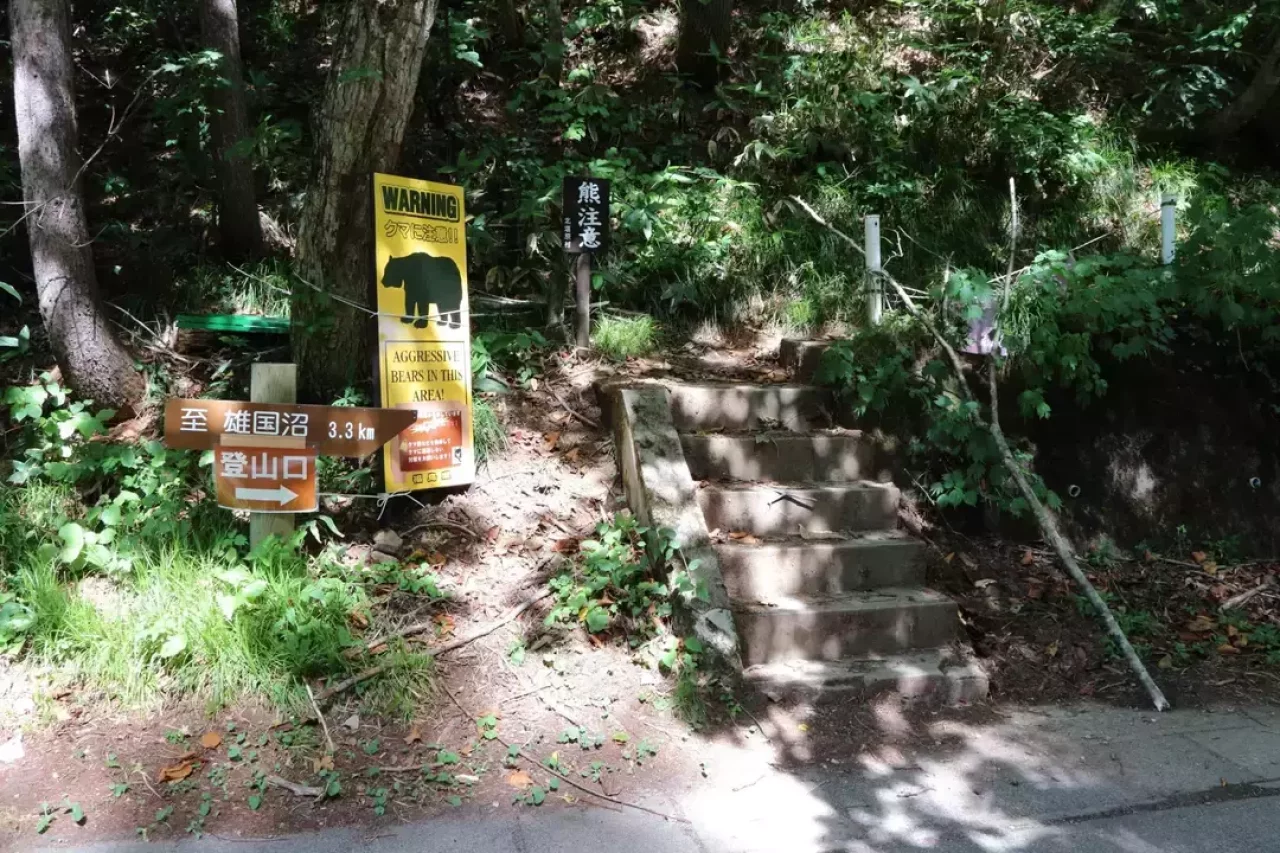 雄子沢登山口から入山します。クマ注意の標識があります。
