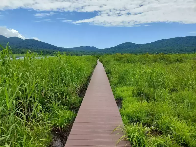 雄国沼では木道を反時計回りに周回。延びる木道、青空、山々の緑、風にそよぐ湖面のすばらしいコントラストを楽しみましょう。