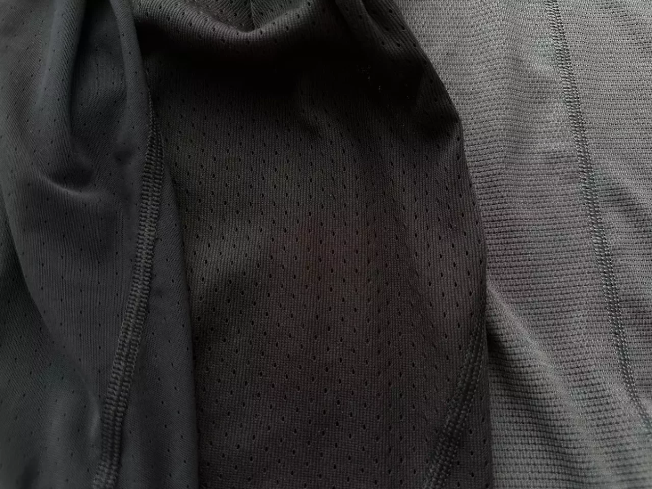 メッシュというと複数の縦の線と横の線が交差した格子状をイメージしますがファイントラックのドライレイヤーは横切る糸が1本もありません。これには理由があってドライレイヤーの上に着用したベースレイヤーが汗を吸収しやすくなるようです。