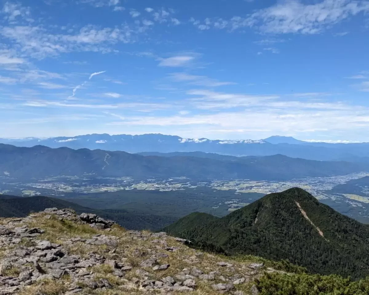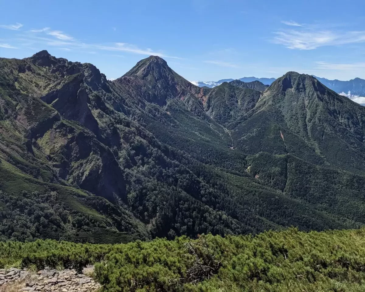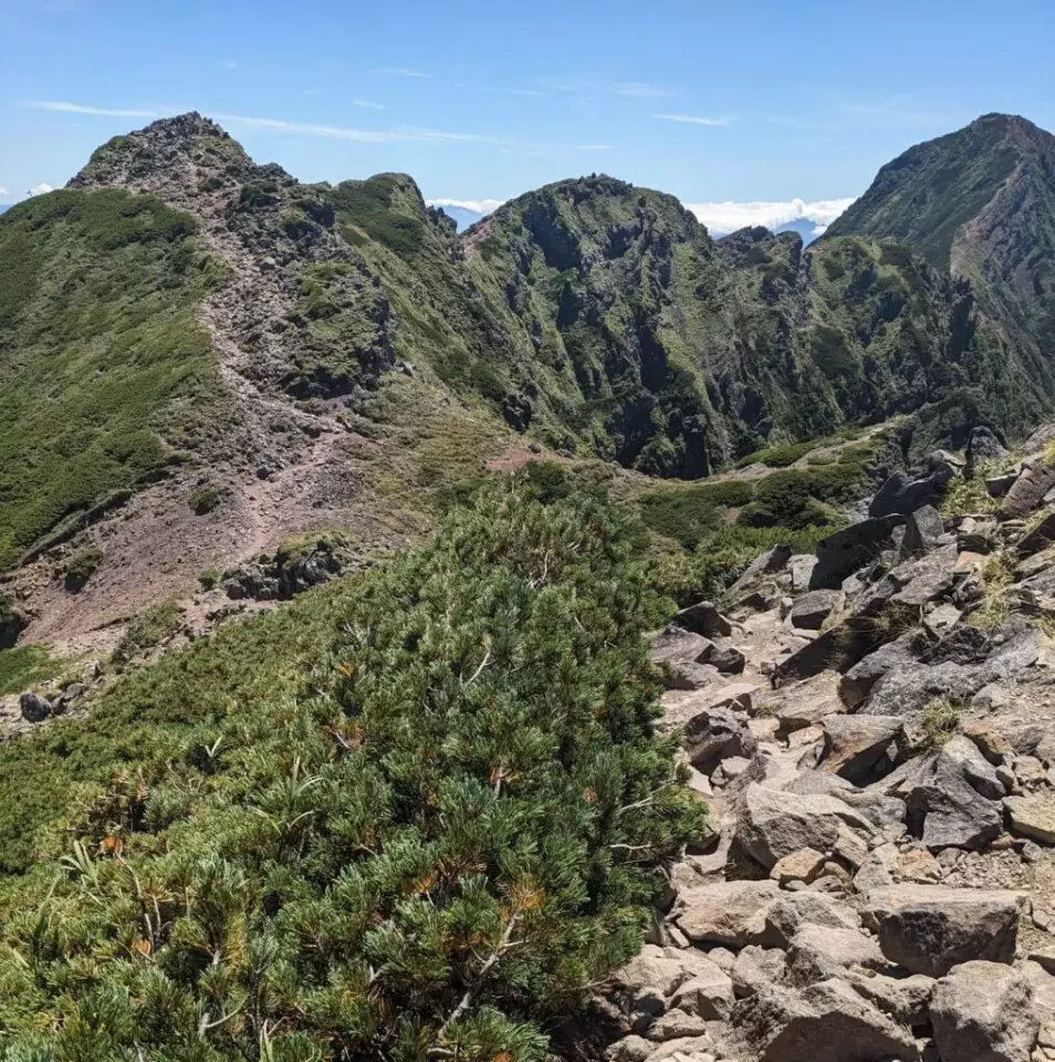 岩場をガシガシ登って振り返ると、北八ヶ岳や硫黄岳など今まで登ってきた山々が見えてきます。
