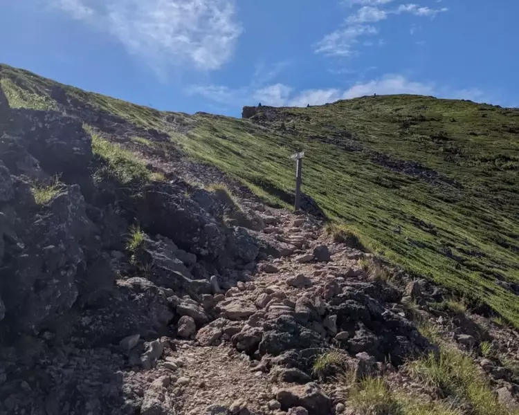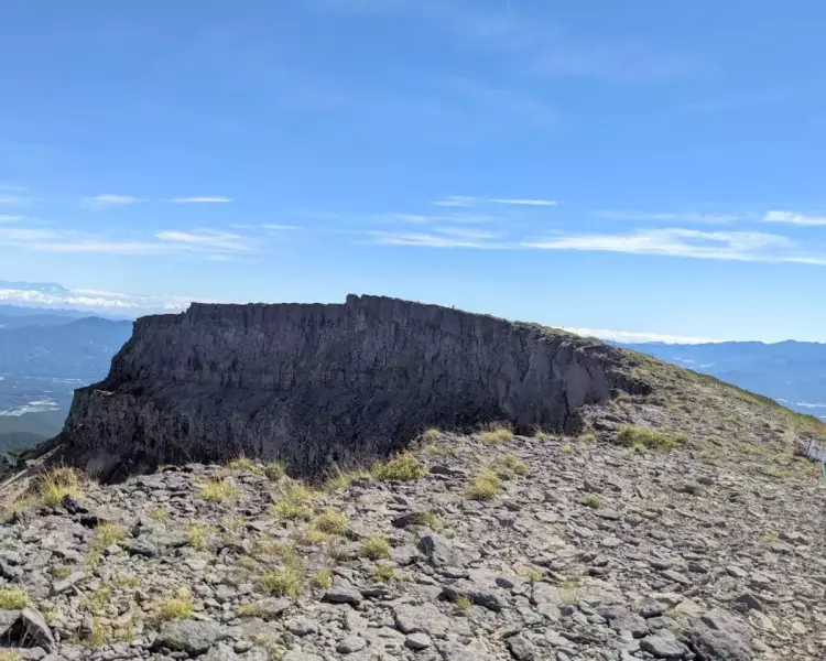 爆裂火口側から見る山頂。時間も9時ごろだったので、人も増えてきました。