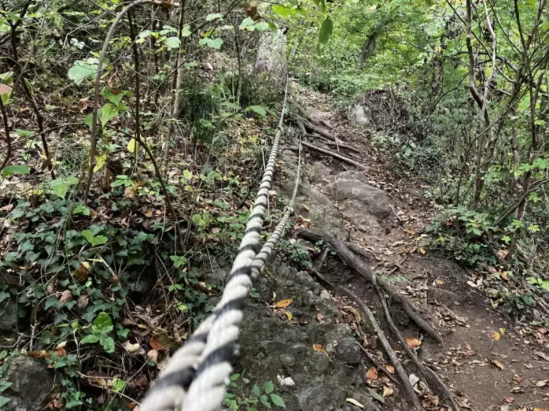 アップダウンの後またしても急降下しますが、尾根道から眼下に袋田の滝が見える「滝のぞき」のスポットがあります。下から見上げればわかりますが、断崖絶壁ですからくれぐれも注意してください。