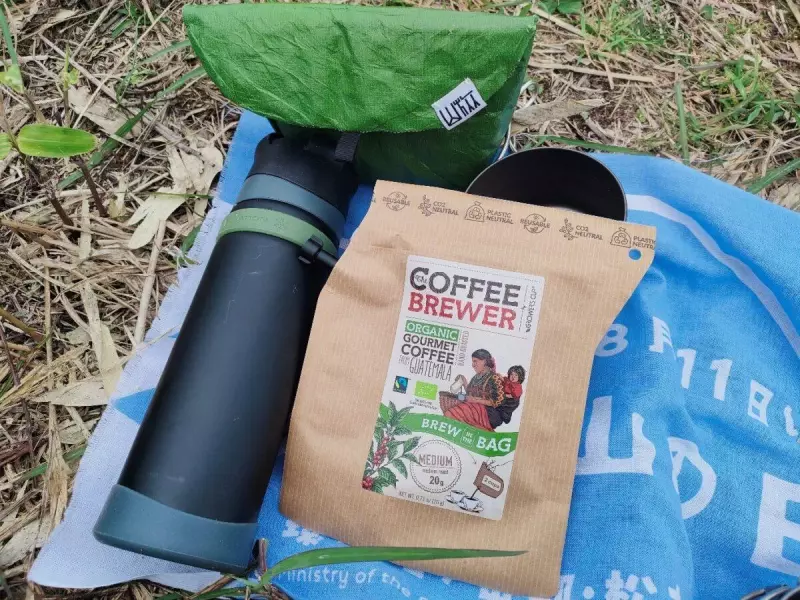 シェラカップをペーパーで綺麗に拭いて、ドリップコーヒーをセット。500mlのステンボトルのお湯を全部使いきりました。