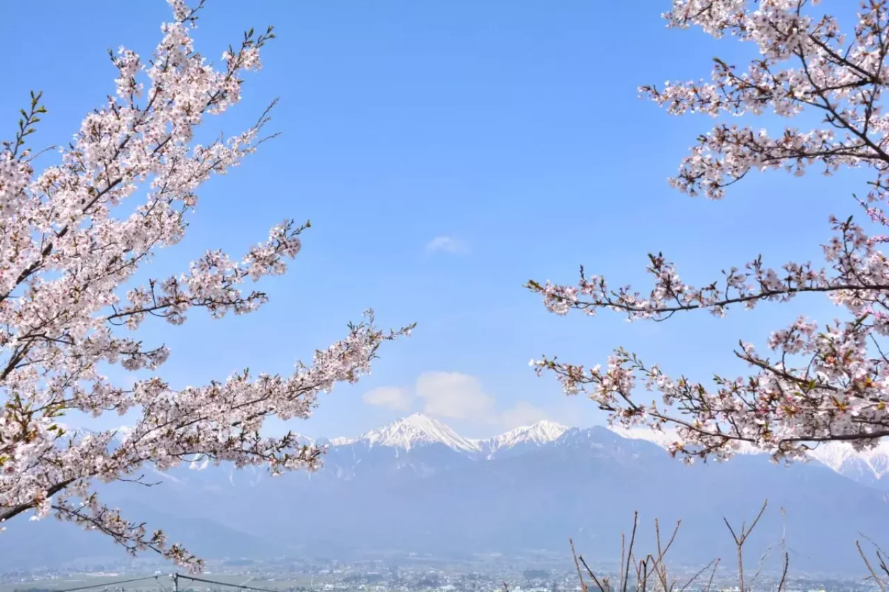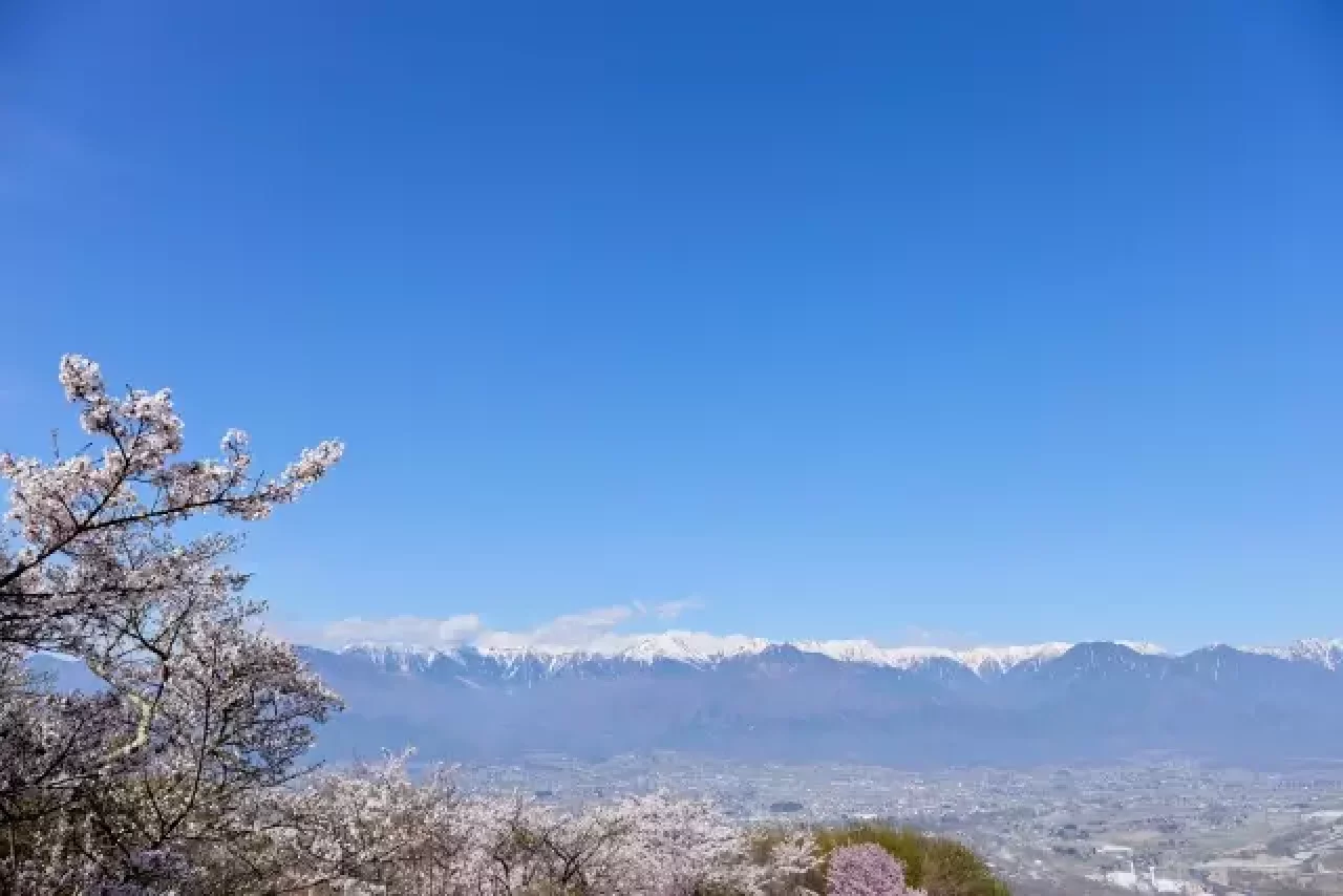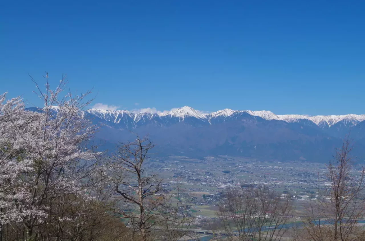長峰山の頂上部は、毎年4月下旬から5月上旬ごろに多くの桜が咲き誇るお花見スポットに変化します。特に展望台からは、桜の花越しに残雪の北アルプスが連なっており、日本らしい美しい光景を楽しむことができます。