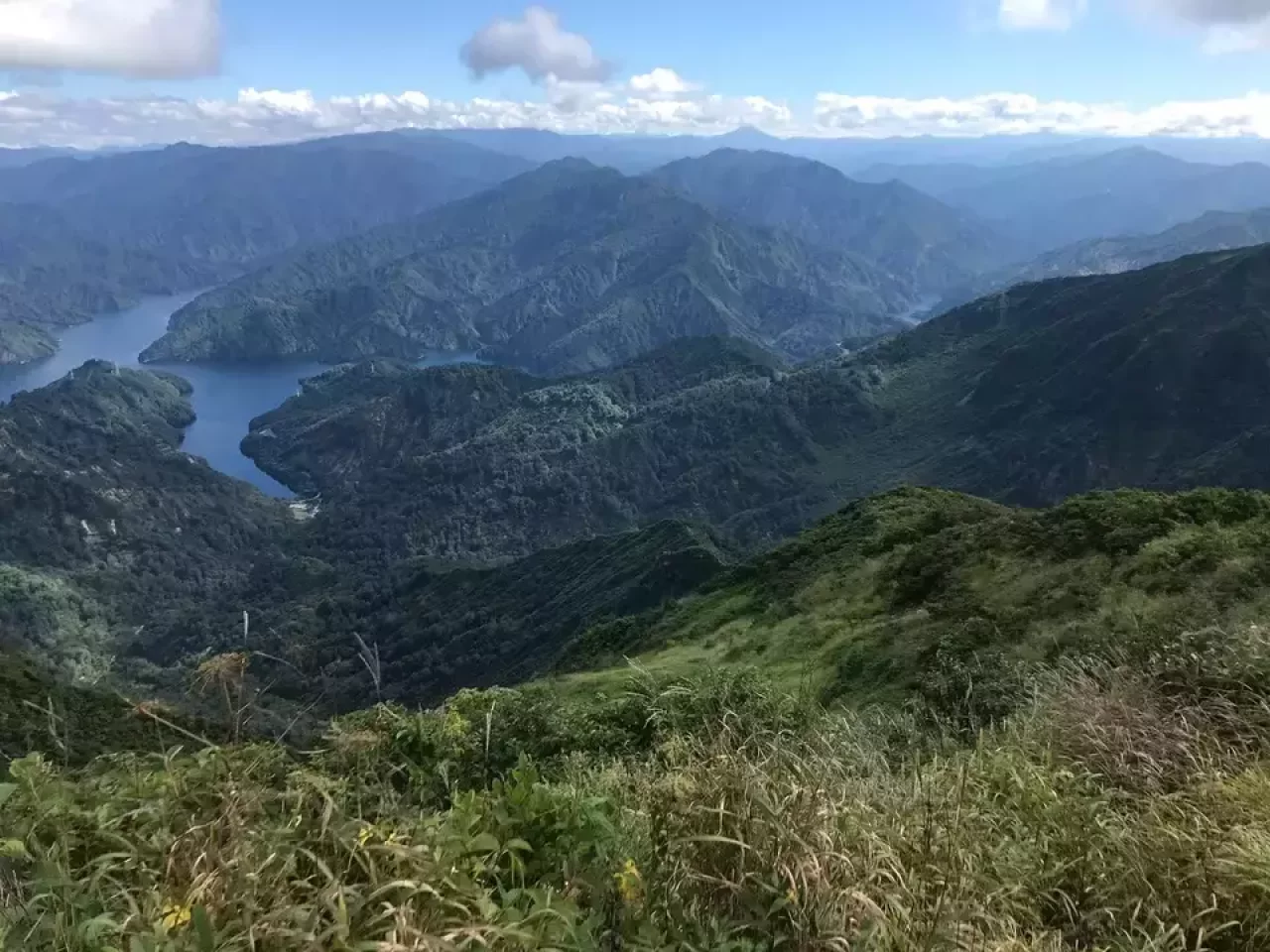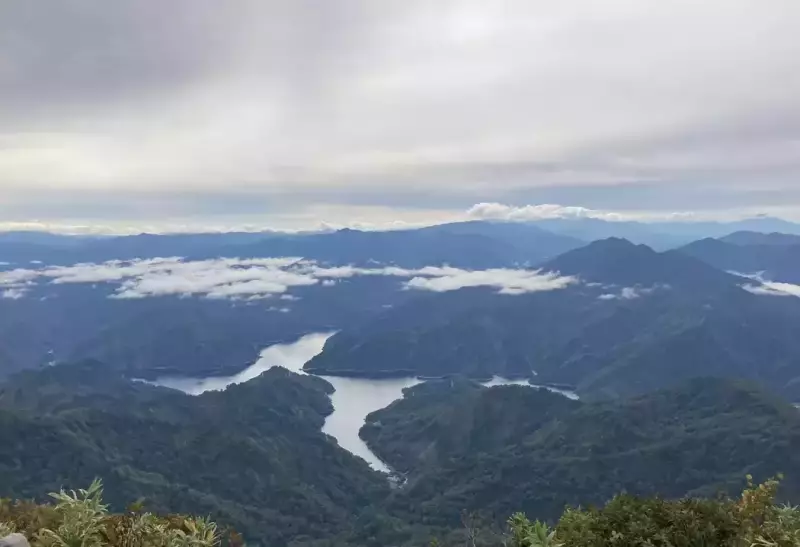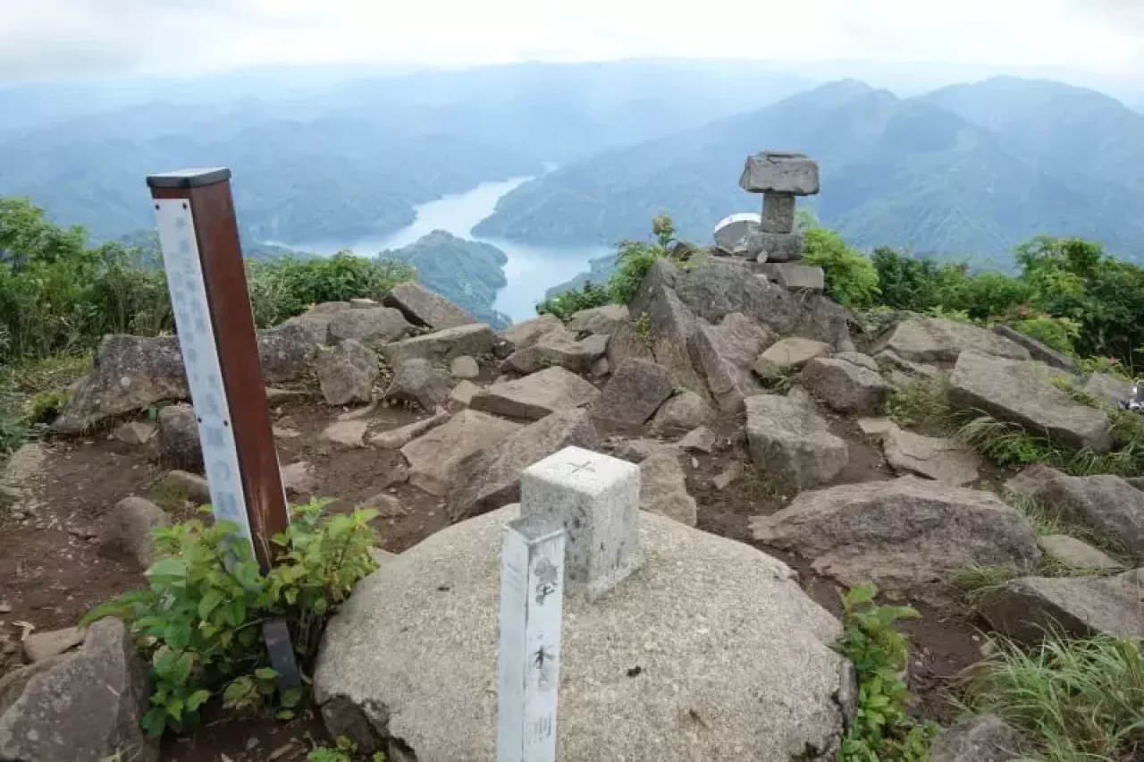 山頂からは360°のパノラマビュー。鬼が面山の迫力ある岸壁と十字型の田子倉湖、そして越後三山がドーンと控えます。少し離れて燧ケ岳も。