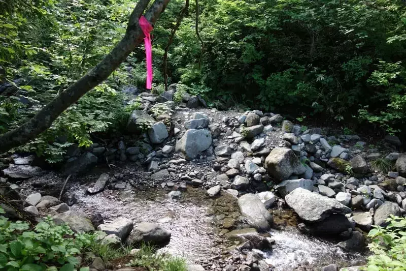 登山口を過ぎると沢沿いを歩くためぬかるんだ道です。渡渉箇所も出てきますので滑らないように注意して進みます。