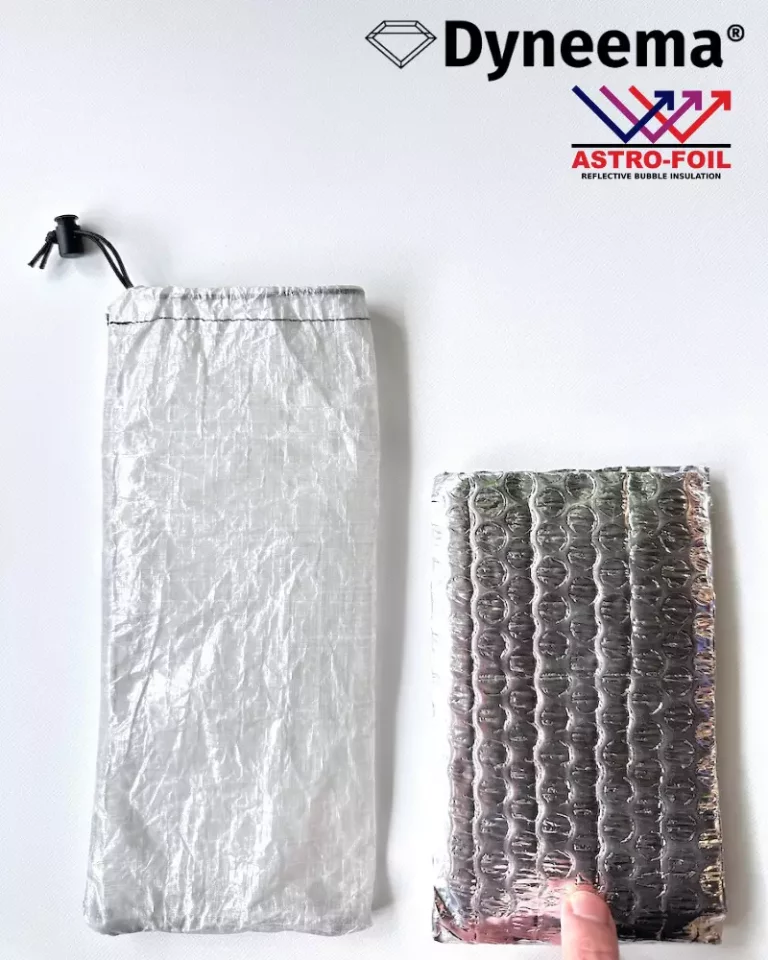 雪山登山でものすごく寒い時には、スマホのバッテリー消費が早くなるのでスマホの保温ケースを使用しています。この保温ケースは厚手のダイニーマケースにアストロフォイルを入れて、その後スマホを中に入れて保温するものです。ダイニーマケースにぴったりとアストロフォイルが収まるようにデザインされているので、スマホを取り出す時にアストロファイルも一緒に出づらいように作られています。