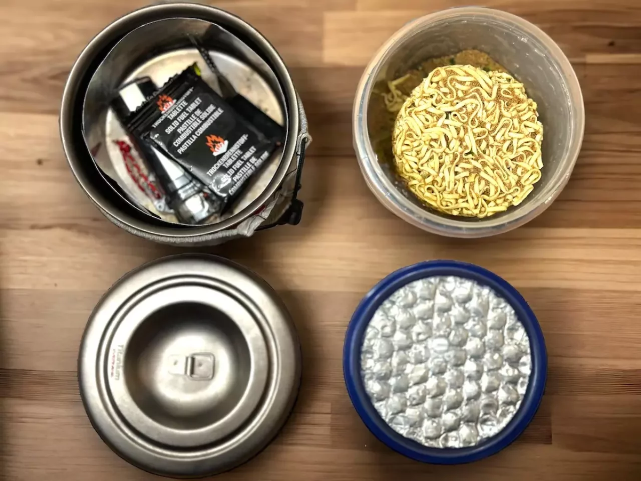カップラーメンの中に熱々のお湯を入れて、3分待つと大抵冷めてしまっています。体を温めるのに熱々のカップラーメンを食べたいのに!!という思いから、山旅ショップで購入できるジップロック®スクリューロックコジーの中にカップラーメンを入れて装備に加え、ゴミは事前に処分しておきます。
