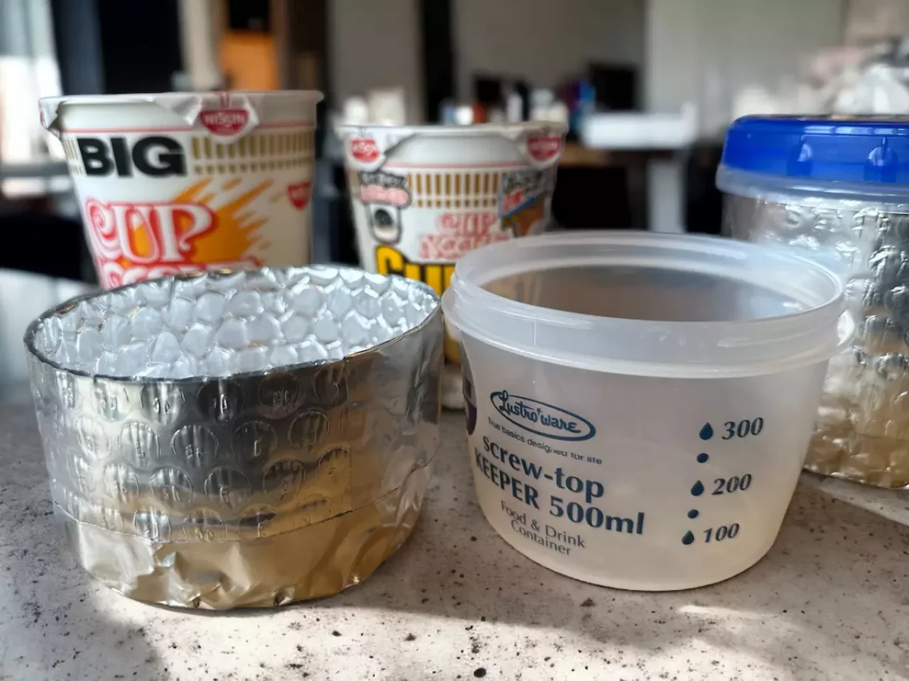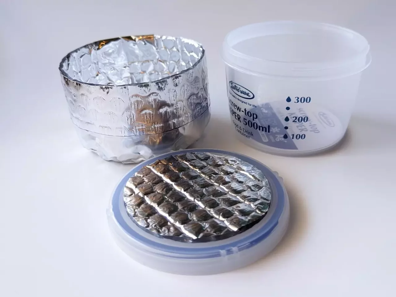 これらのスクリューロック容器にアストロフォイルを使った保温ケースを本体に、蓋の部分にアストロファイルを両面テープで貼り付けたのが今回紹介するアイテムです。